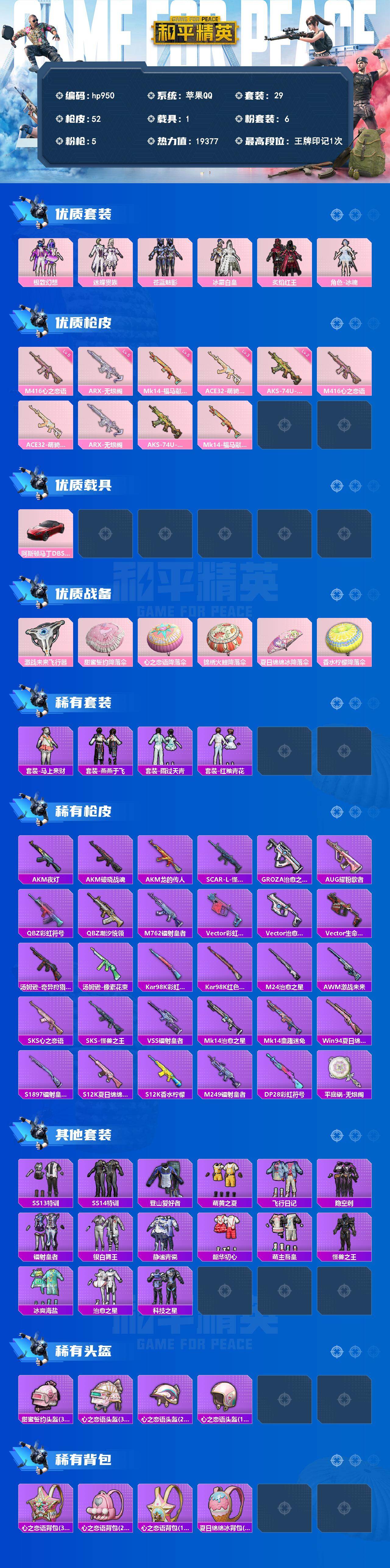 苹果 手Q-6粉装-5特效枪-1载具-1粉色飞行器-19377热力值-1王牌印记-29套装-52枪皮