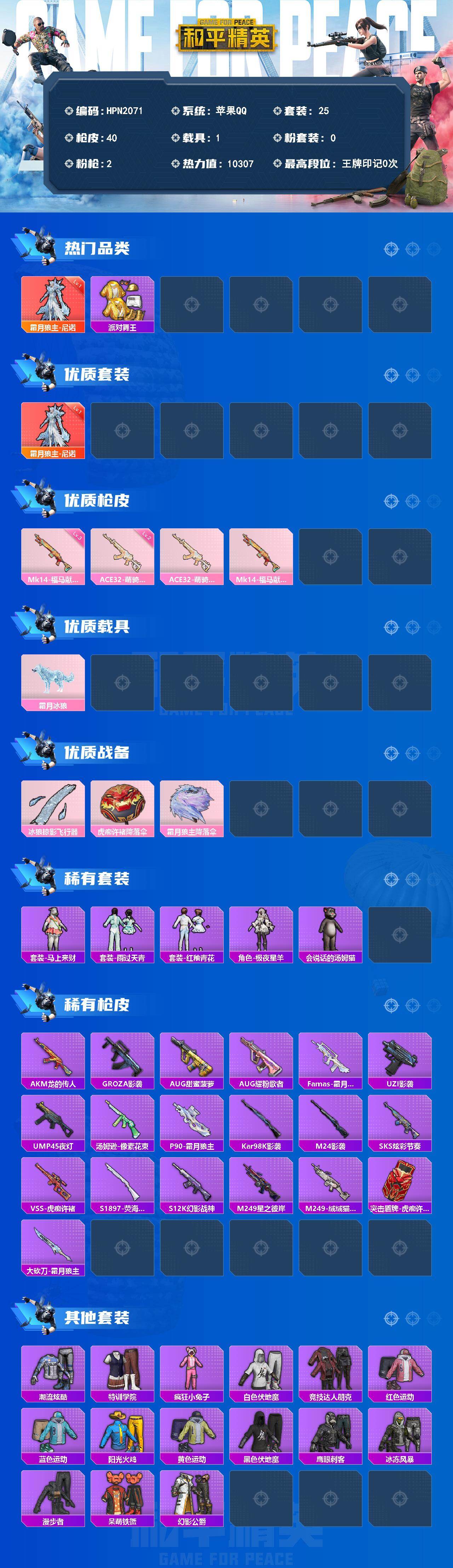 苹果 手Q-1神装-0粉装-2特效枪-1载具-1粉色飞行器-10307热力值-0王牌印记-25套装-40枪皮