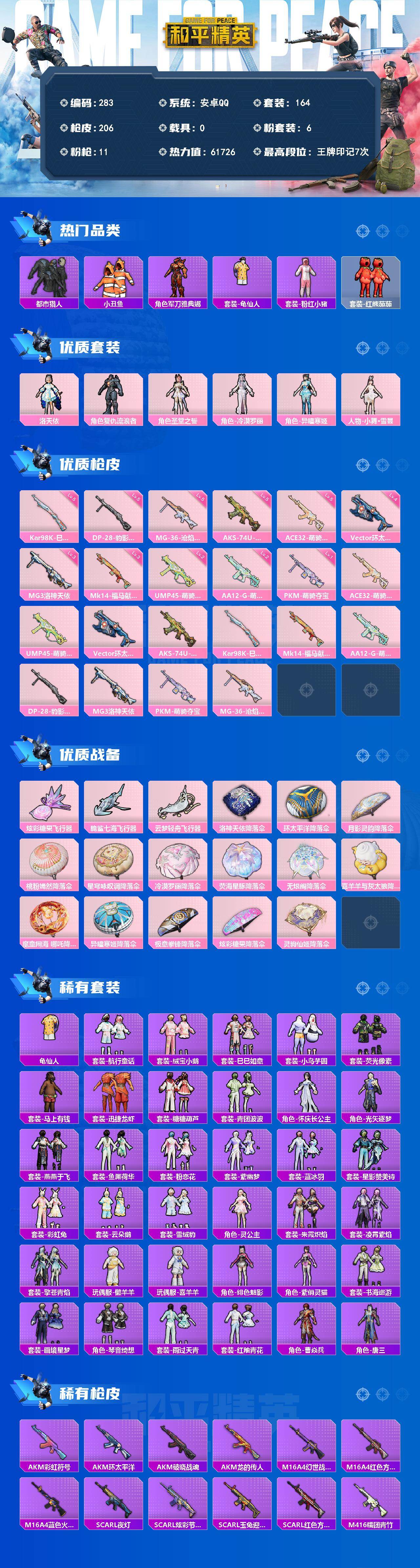 A1737安卓 手Q-6粉装-11特效枪-0载具-3粉色飞行器-61726热力值-7王牌印记-164套装-206枪皮