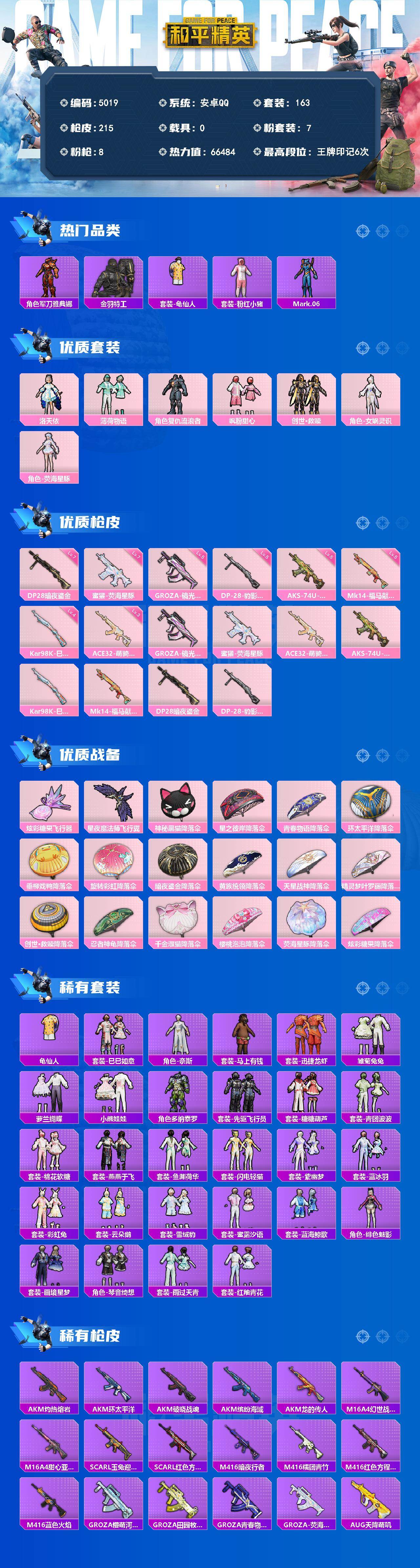 满级地铁安卓 手Q-7粉装-8特效枪-0载具-2粉色飞行器-66484热力值-6王牌印记-163套装-215枪皮