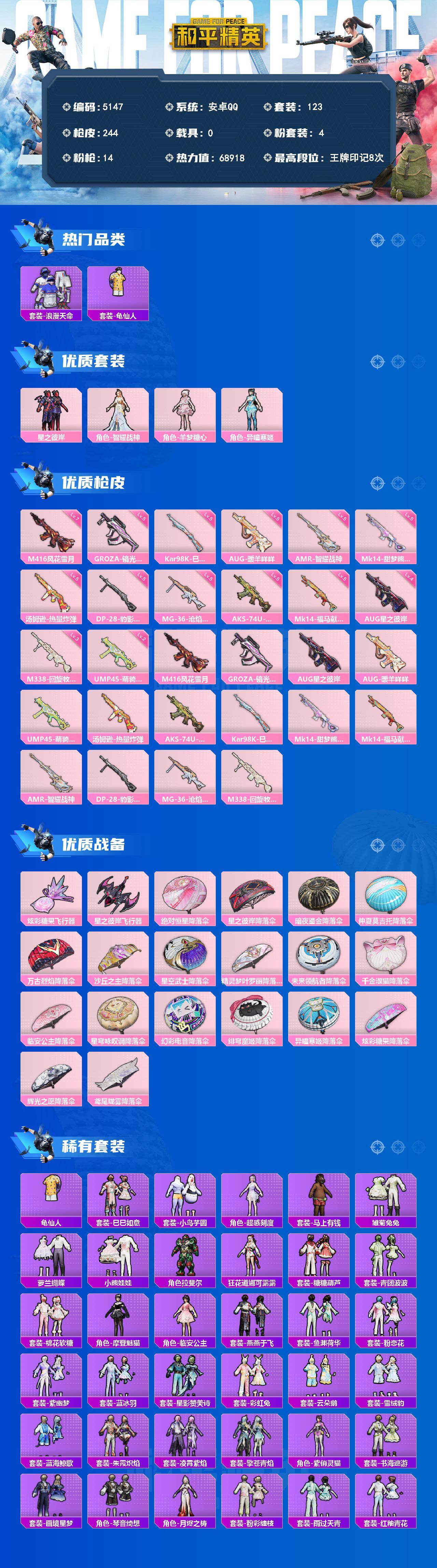 安卓 手Q-4粉装-14特效枪-0载具-2粉色飞行器-68918热力值-8王牌印记-123套装-244枪皮