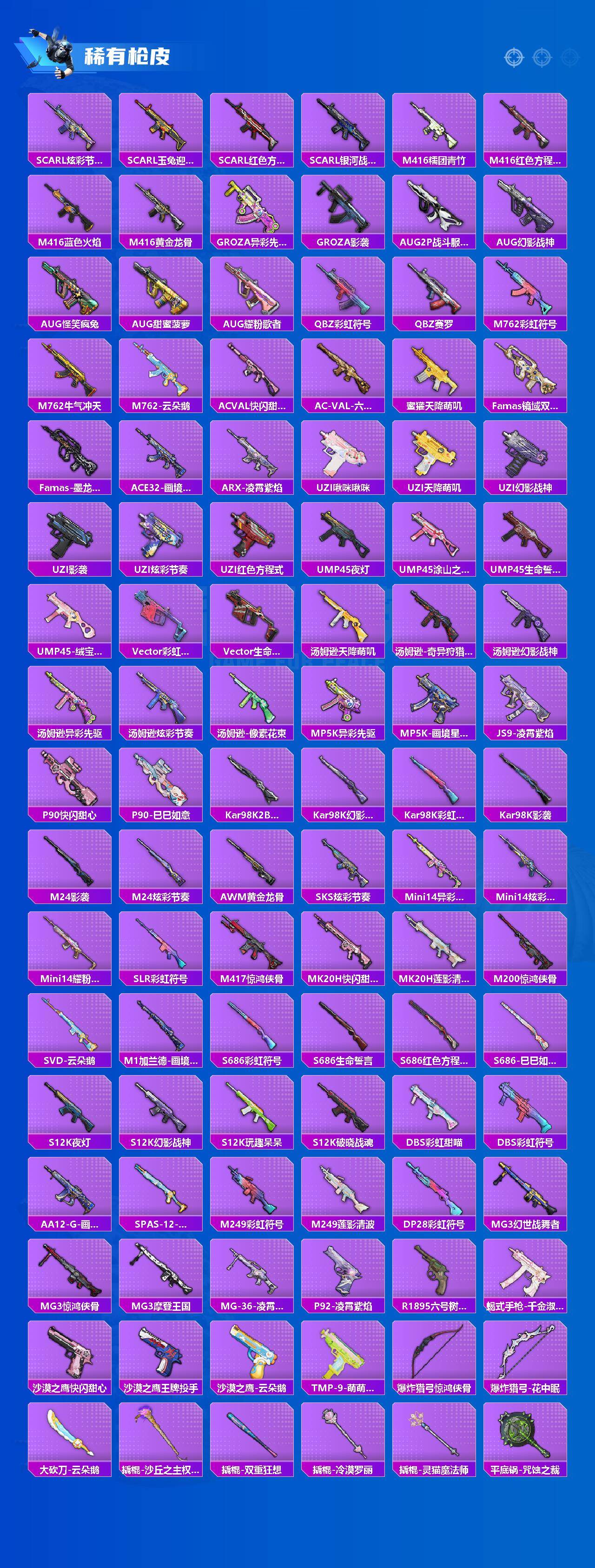 【粉色枪皮等级】:M416-电玩时刻(五级),GROZA-镜光银凌(五级),AUG-暖羊咩咩(五级),M762-青锋波束(五级),UMP45-萌骑冒险(三级),A