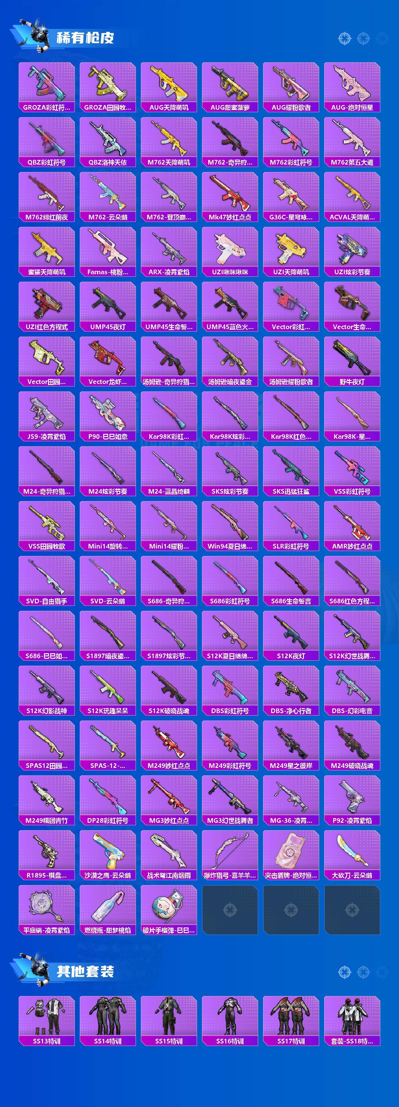 【粉色枪皮等级】:M416-风花雪月(七级),GROZA-镜光银凌(五级),A
