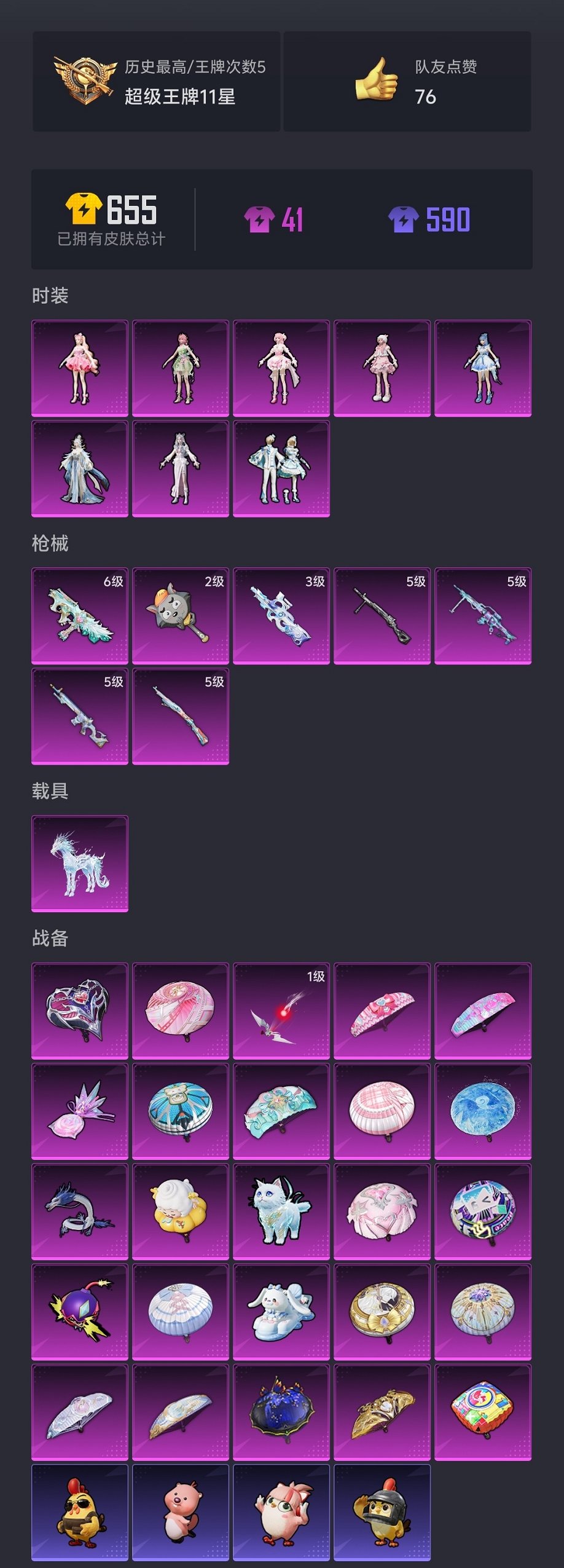 【双区女号8粉装7特效枪1载具 安卓区5粉装3特效枪 秒换绑不用等】 苹果Q区-49628热力值-5印记-112套装-161枪皮 【1载具】 冰绡玉鳞【8粉装】 角色-冷漠罗丽 角色-樱桃泡泡 角色-宁雨蝶 雪月幻音 角色-奇迹舞步 美琪 美雪 角色-羊梦糖心 角色-花灵【7特效枪】 MK12-雪月幻音(5级) Kar98K-巳巳如意(5级) JS9-奇迹舞步(6级) DP-28-豹影疾电(5级