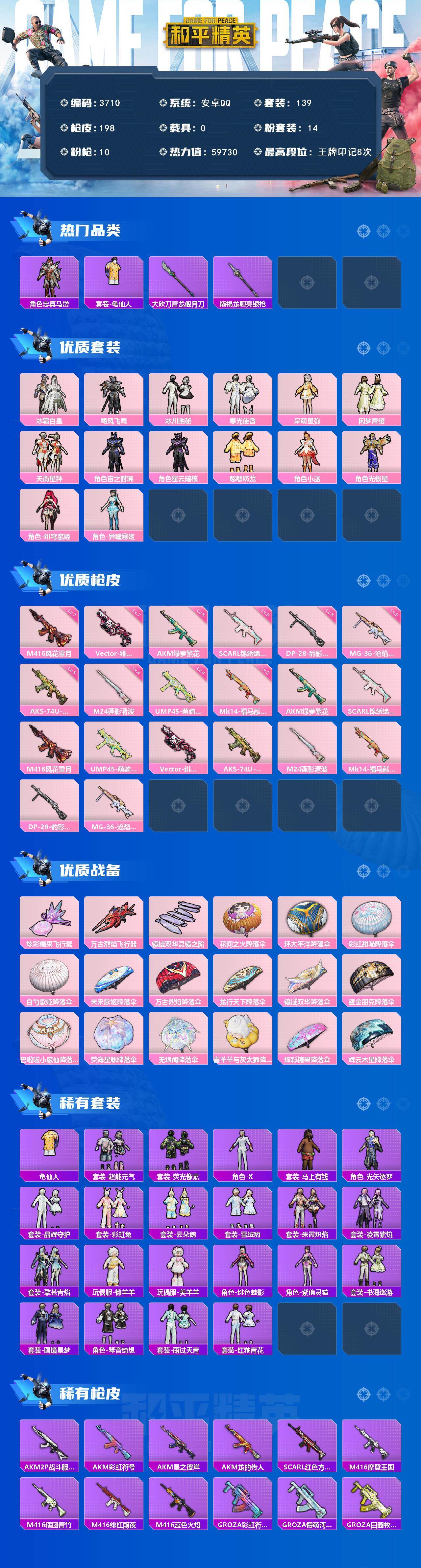安卓 手Q-14粉装-10特效枪-0载具-3粉色飞行器-59730热力值-8王牌印记-139套装-198枪皮