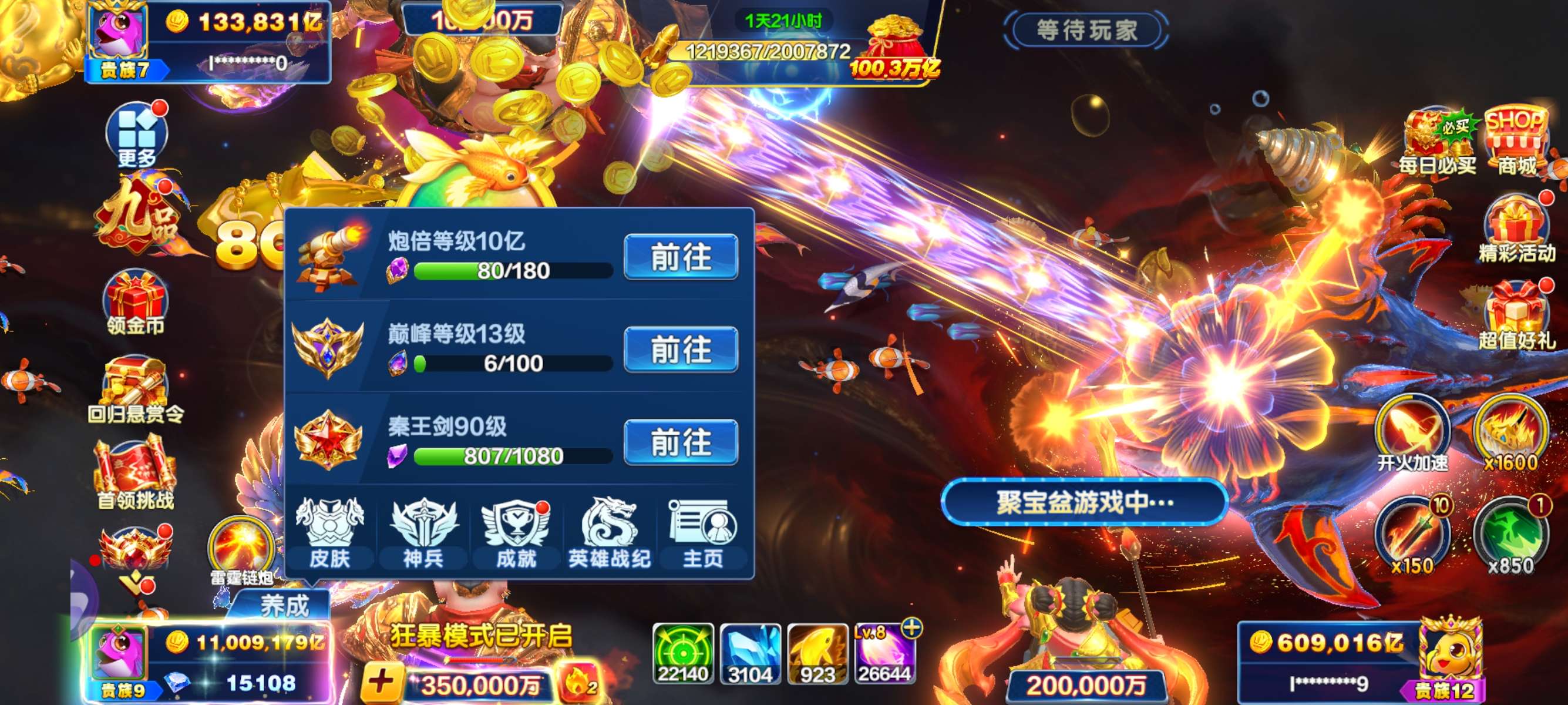 捕鱼大咖联想版 1100万亿 40加成 实炮10 虚炮350 秘宝过半