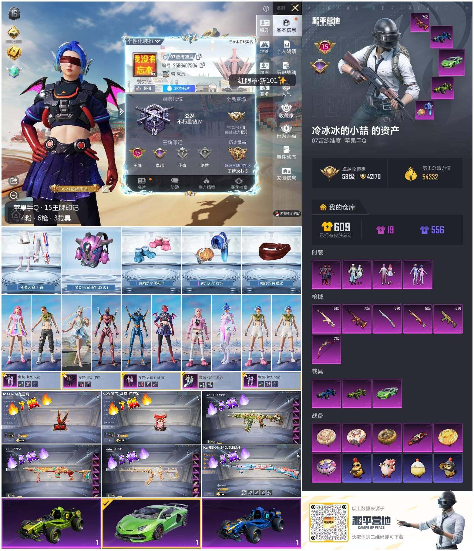 A1972苹果 手Q-4粉装-6特效枪-3载具-0粉色飞行器-54332热力值-15王牌印记-127套装-178枪皮