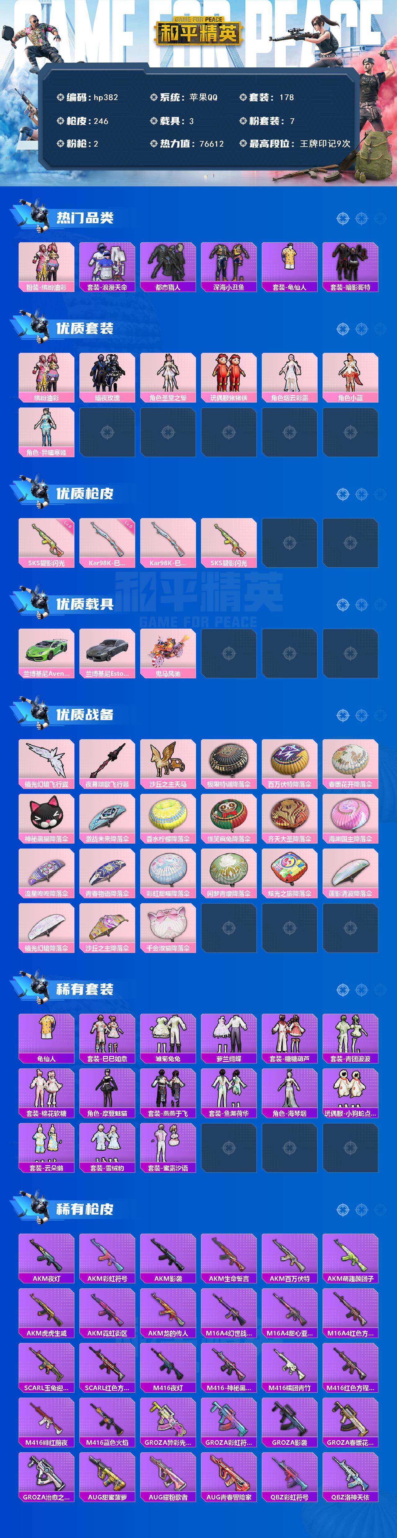 苹果 手Q-7粉装-2特效枪-3载具-3粉色飞行器-76612热力值-9王牌印记-178套装-246枪皮