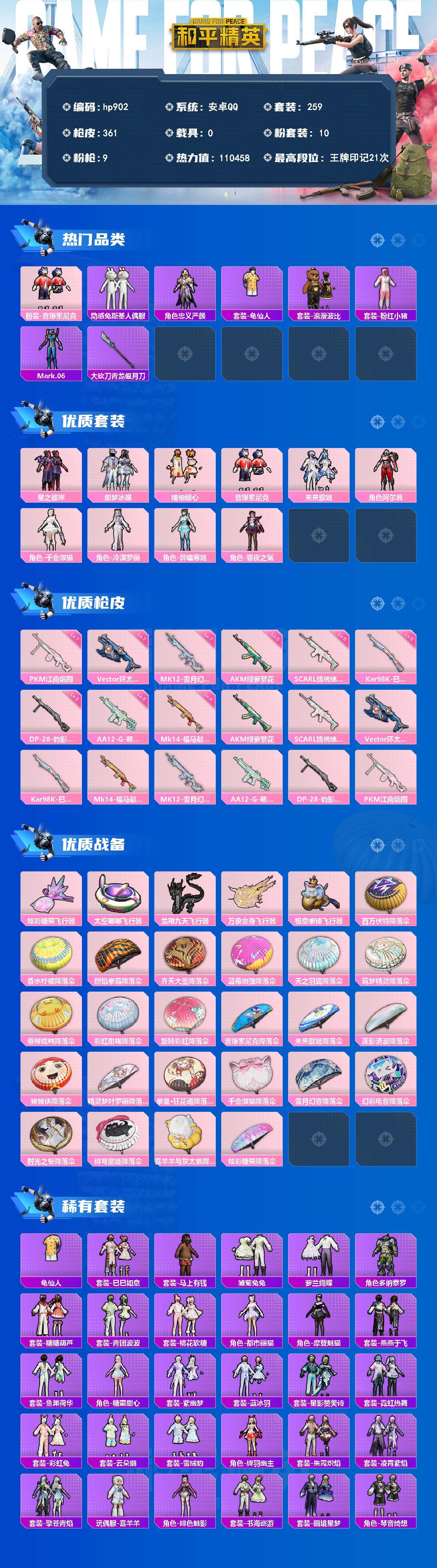 安卓 手Q-10粉装-9特效枪-0载具-5粉色飞行器-110458热力值-21王牌印记-259套装-361枪皮