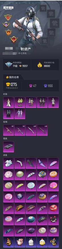 实名: 可修改 时装数: 1069 载具数: 1 枪械数: 328 战备数: 251 热门装扮: 奇异狩猎者,梦幻火箭(新101),数码大师,宝贝奶油派,浪漫波比,梦魇先生,万圣娃娃,鹰眼刺客,PEL轰鸣竞梦者,银刃赛罗,恐龙拽拽,激萌罗小黑,奇迹天团,蔷薇魔法师,神秘黑猫,萨利娅 载具: 兰博基尼Estoque(银翼灰) 稀有枪皮: AKM-炫紫旋律(七级),M416-心之恋语(七级),Kar