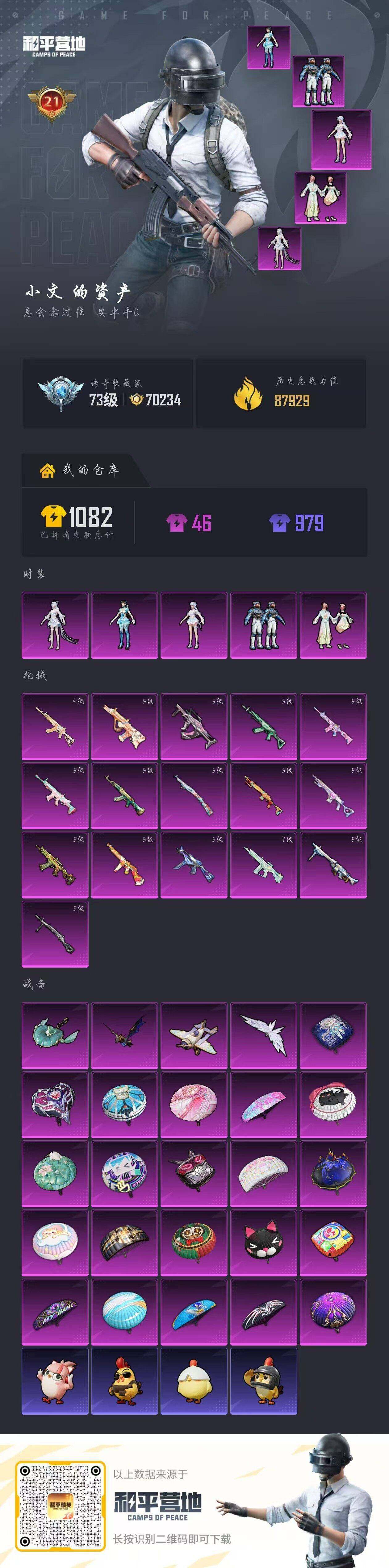 【和平精英连体王者荣耀】时装数: 809 枪械数: 298 战备数: 227 热门装扮: 奇异狩猎者,呆萌铁蟹,鹰眼刺客,莲影清波,未来领航者,荧海星豚,异瞳寒姬,月中灵 稀有枪皮: AKM-绿萝繁花(五级),SCAR-L-锦绣绵绵(五级),M416-电玩时刻(五级),GROZA-镜光银凌(五级),AUG-暖羊咩咩(五级),M762-青锋波束(五级),ACE32-萌骑漫游(四级),UMP45-量
