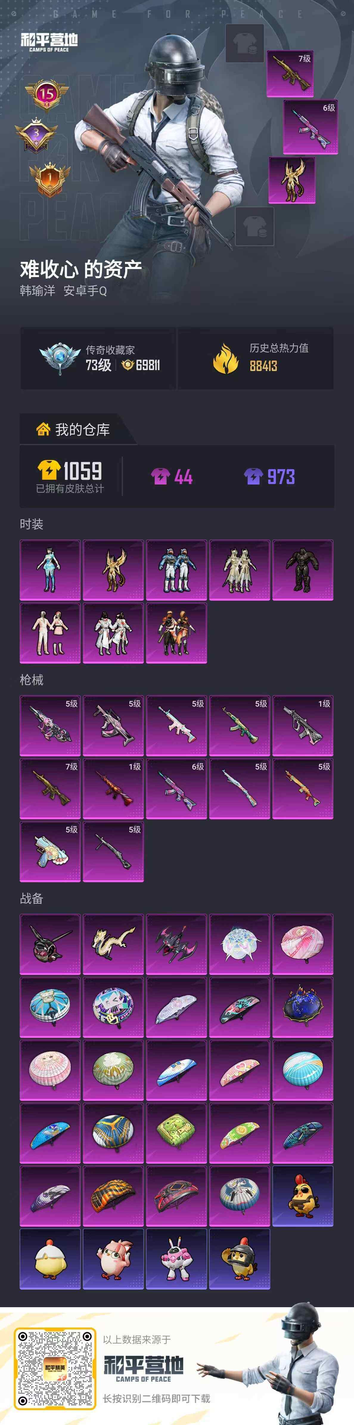 【钱包无法注销 不影响游戏和账号安全】【和平精英连体王者荣耀】时装数: 193 枪械数: 279 战备数: 208 热门装扮: 东方飞龙,烈焰拳霸,俏雪含霜,第五大道,猩猩队长,射星猎手,未来领航者,凤凰座 一辉,异瞳寒姬 稀有枪皮: AKM-炫紫旋律(六级),AKM-绿萝繁花(五级),SCAR-L-锦绣绵绵(五级),M416-五爪金龙(七级),M416-风花雪月(一级),GROZA-镜光银凌(