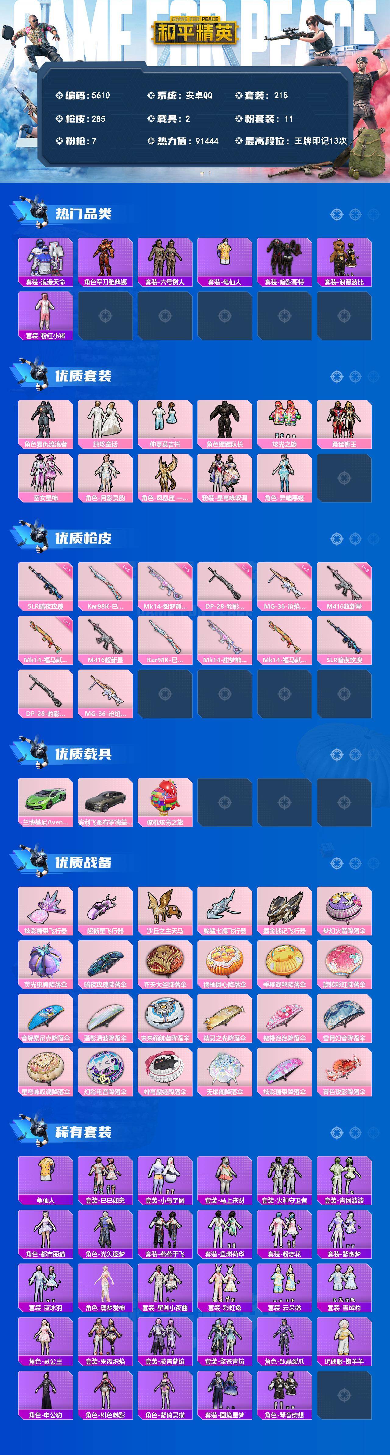 满级地铁安卓 手Q-11粉装-7特效枪-2载具-5粉色飞行器-91444热力值-13王牌印记-215套装-285枪皮