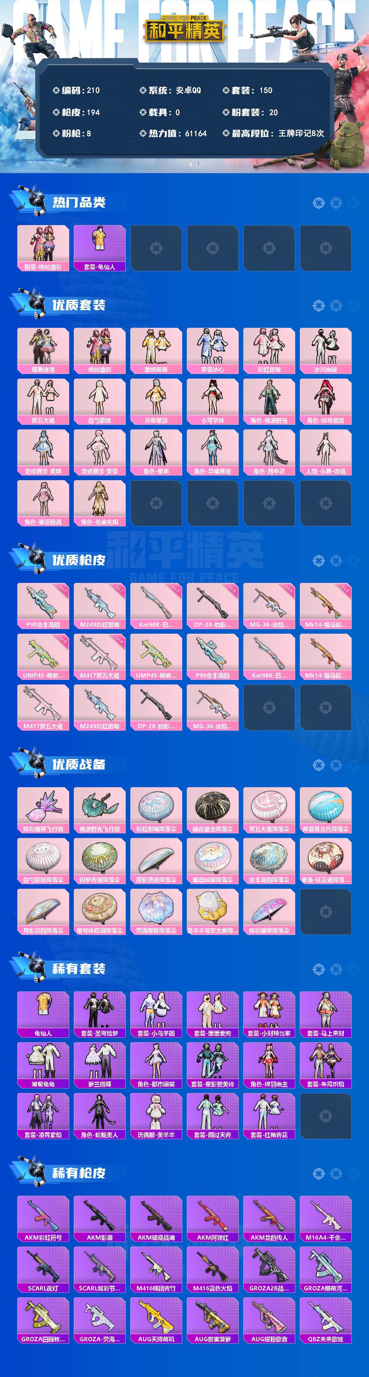A1891安卓 手Q-20粉装-8特效枪-0载具-2粉色飞行器-61164热力值-8王牌印记-150套装-194枪皮