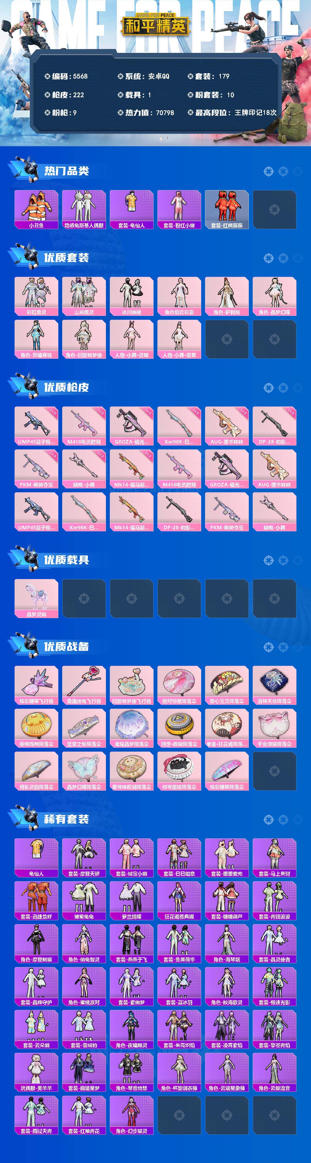 女号番茄 满级地铁安卓 手Q-10粉装-9特效枪-1载具-3粉色飞行器-70798热力值-18王牌印记-179套装-222枪皮