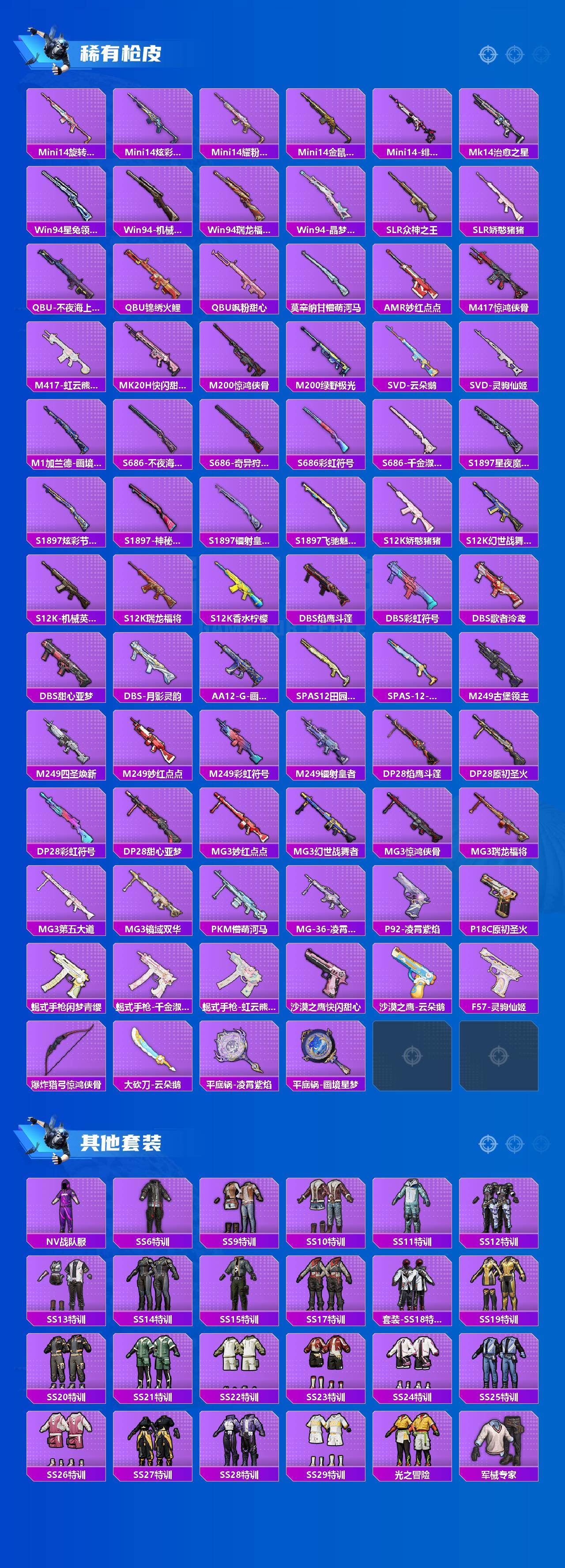 【粉色套装】:粉装-深渊皇后,粉装-缤纷油彩,粉装-极致幻想,粉装-霓裳武神,粉装-未来歌姬,粉装-炫光之旅,粉装-射星猎手,角色-千金淑猫,角色-樱桃泡泡,角色-辉云木星,角色-极地冰晶