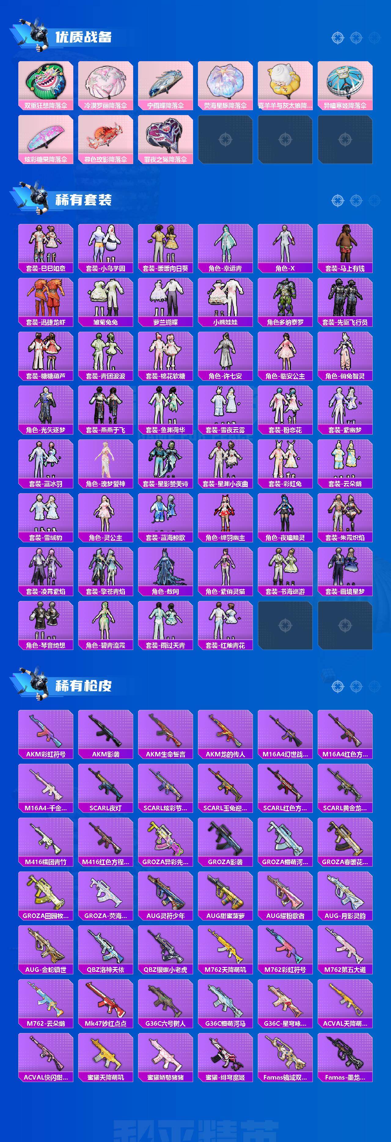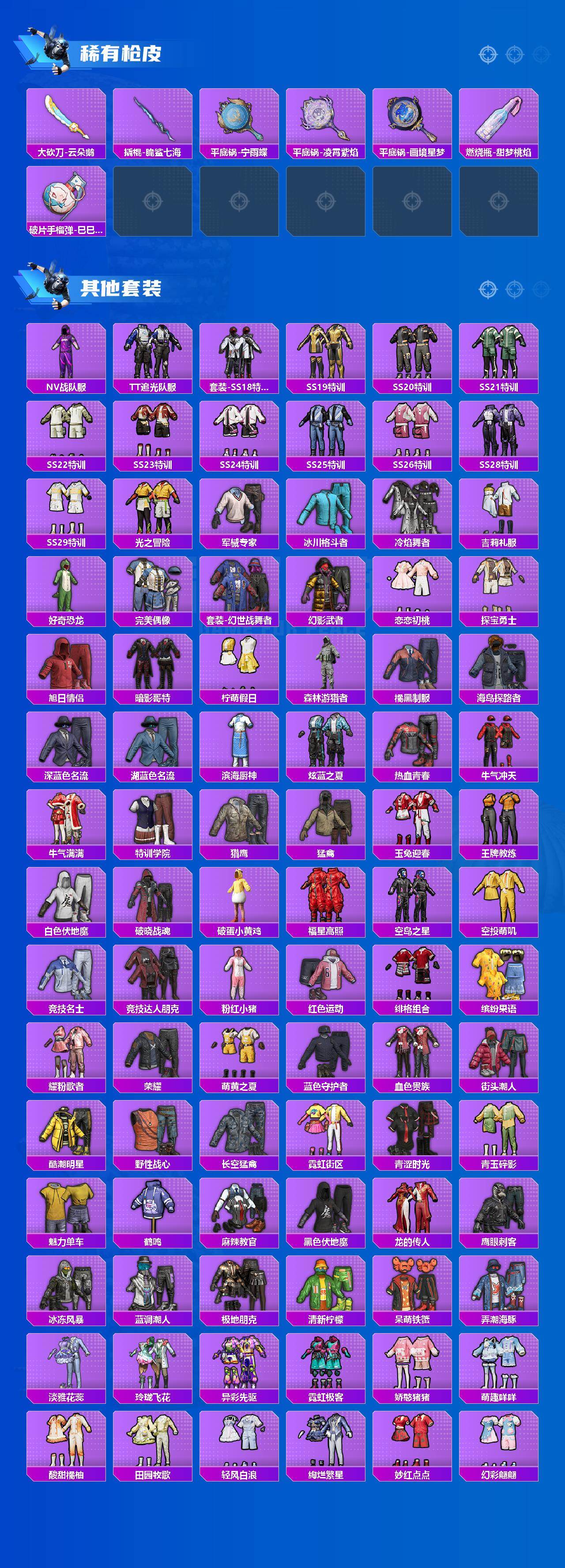 【粉色套装】:粉装-天使彩虹糖,粉装-蝶舞迷情,粉装-未来歌姬,粉装-金丰海韵,粉装-未来领航者,角色-千金淑猫,角色-萨利娅,粉装-幻彩电音,角色-绯穹魔姬,角色-羊梦糖心