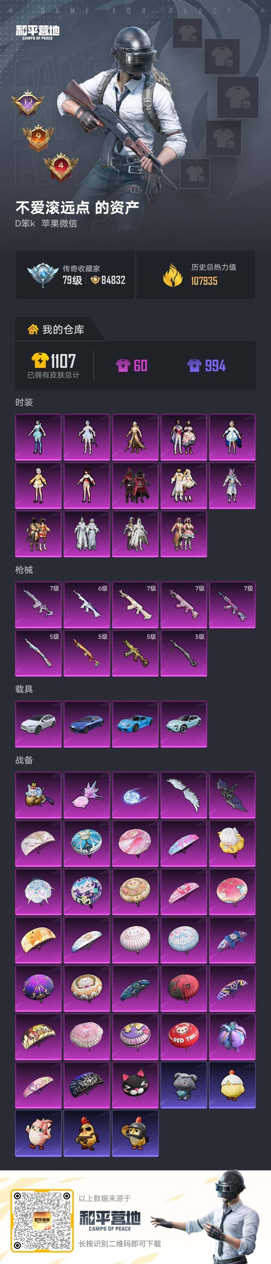 苹果 微信-14粉装-9特效枪-4载具-5粉色飞行器-107935热力值-21王牌印记-194套装-314枪皮