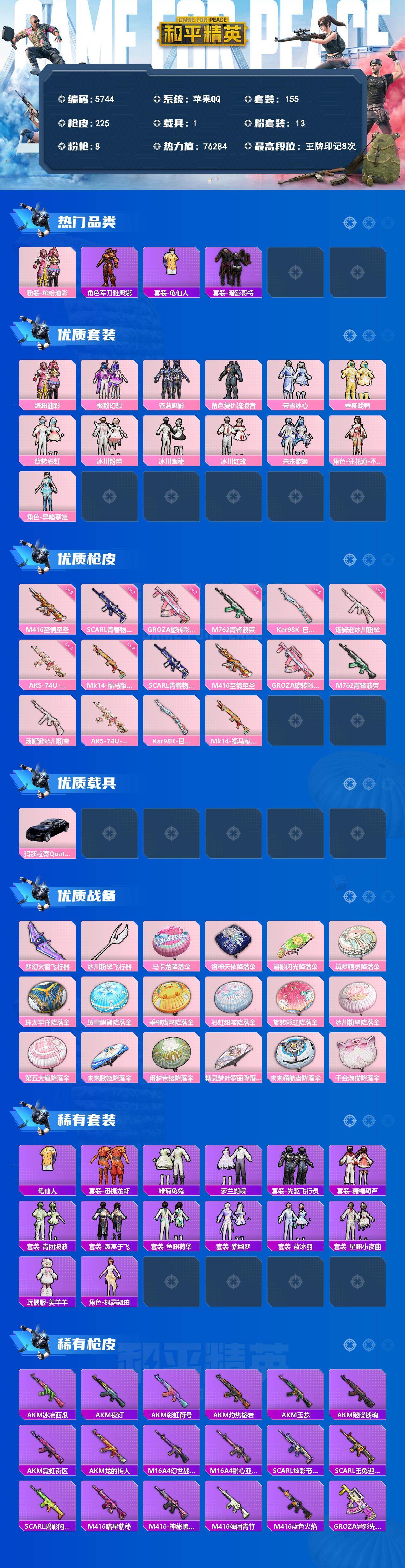 九级至情至圣 眼罩 满级地铁 苹果 手Q-13粉装-8特效枪-1载具-2粉色飞行器-76284热力值-8王牌印记-155套装-225枪皮