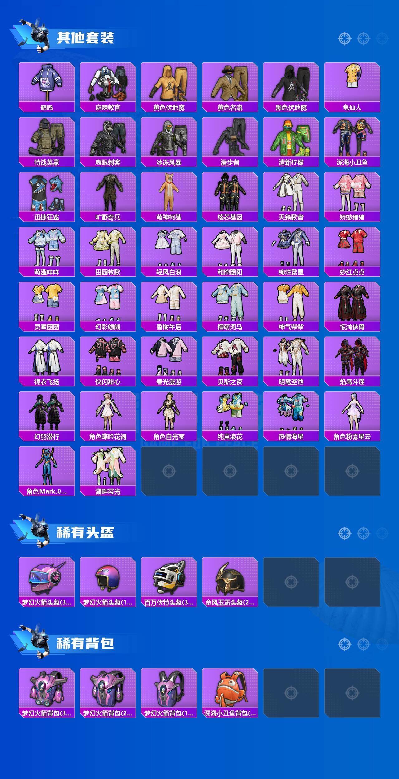 【热门品类】:粉装-梦幻火箭,套装-浪漫天命,套装-都市猎人,套装-派对舞王,套装-深海小丑鱼,角色-军刀雅典娜,套装-龟仙人,套装-暗影哥特,角色-Mark.06