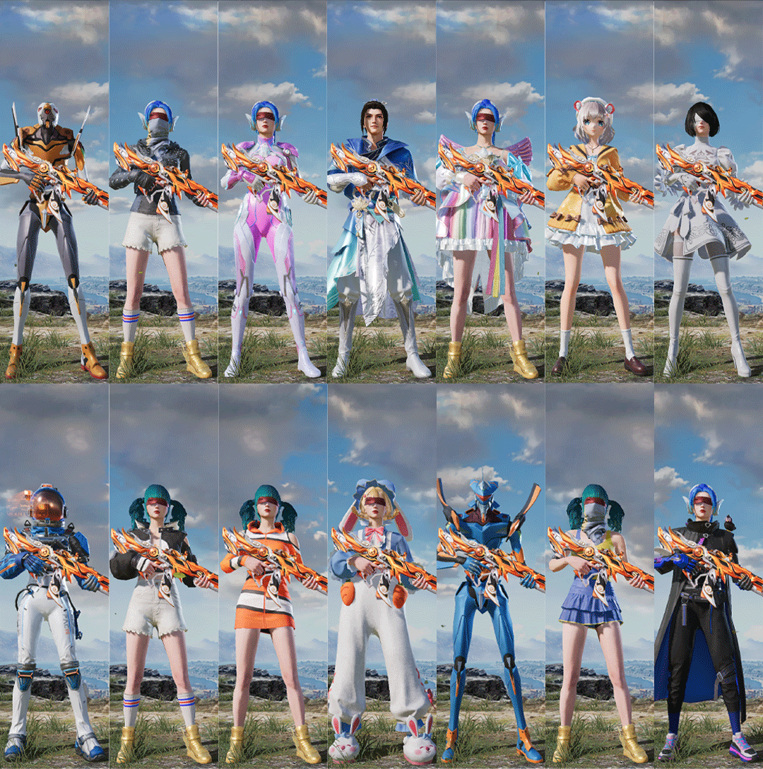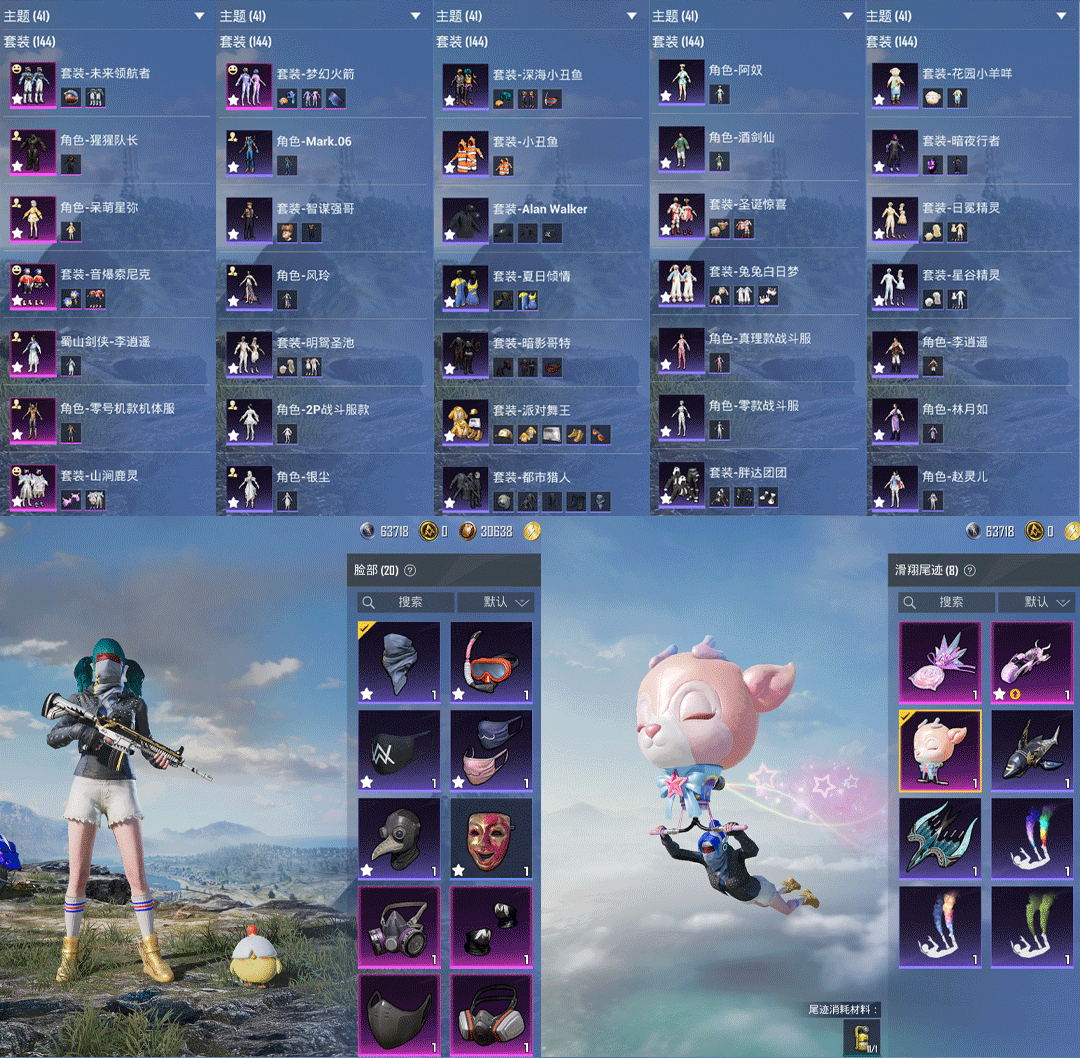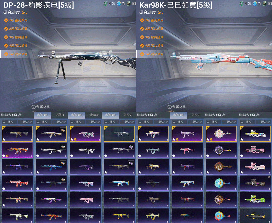 特效枪6:M416-至情至圣/7级,,AUG-超新星/7级,,平底锅-林间仙鹿/4级,,UMP45-玉魂晶魄/5级,DP-28-豹影疾电/5级,,Kar98K-巳巳如意/5级,,