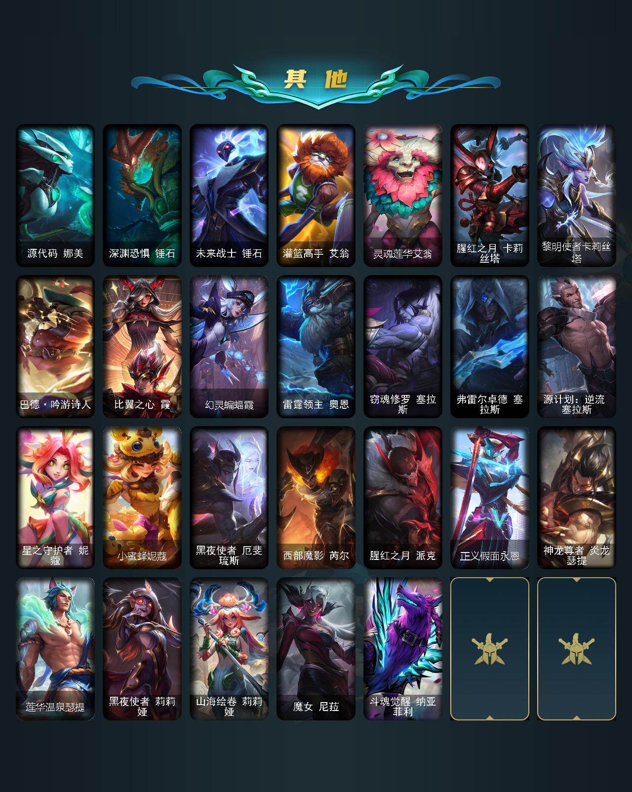 【至臻皮肤】:至臻星之守护者索拉卡,至臻源计划正义艾瑞莉娅,至臻暗星墨菲特,至臻黑夜使者李青,至臻黑夜使者李青(2022),至臻灵能特工伊泽瑞尔,至臻KDA阿卡丽,至臻王国机神玄武盖伦,至臻西部魔影猎天使恶魔泰隆,至臻玉剑
