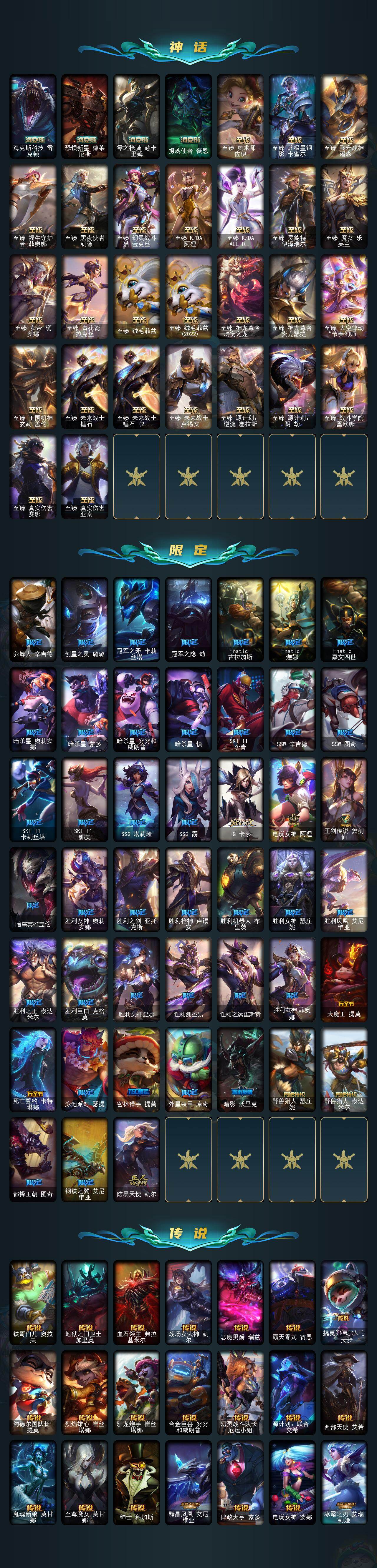 【至臻皮肤】:至臻魔女乐芙兰,至臻飞升战神潘森,至臻灵能特工伊泽瑞尔,至臻王国机神玄武盖伦,至臻战斗学院蕾欧娜,至臻青花瓷拉克丝,至臻KDA阿狸,至臻绒毛菲兹,至臻绒毛菲兹(2022),至臻神龙尊者均衡之龙沃利贝尔,至臻福牛守护