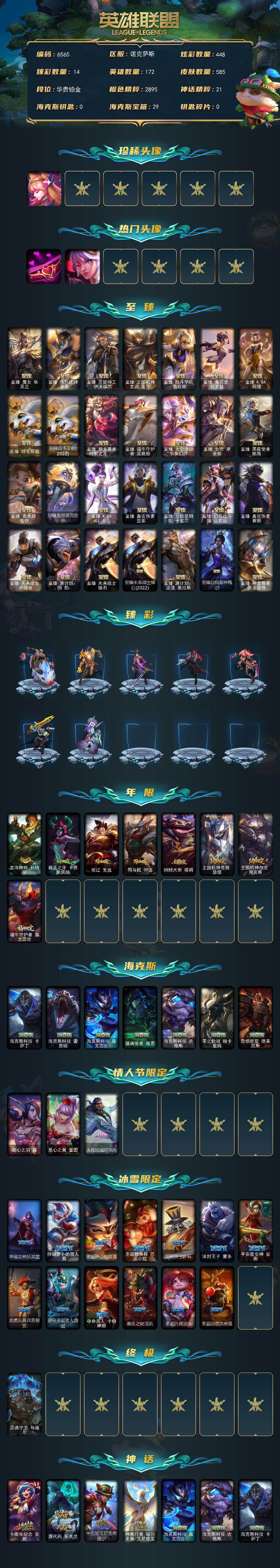铂金段位-172英雄-585皮肤-448炫彩-1终极-39神话-69限定-59传说-131史诗