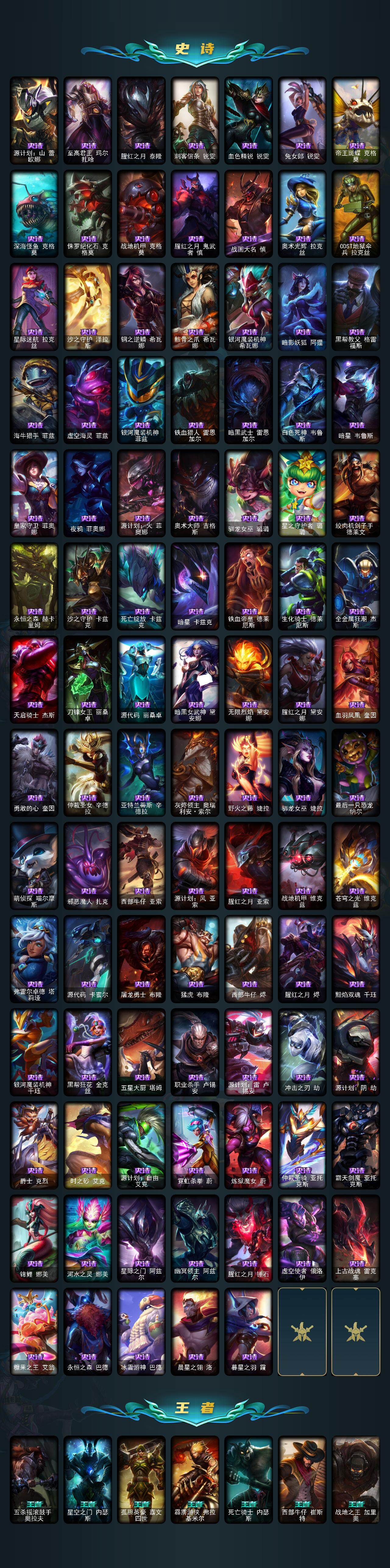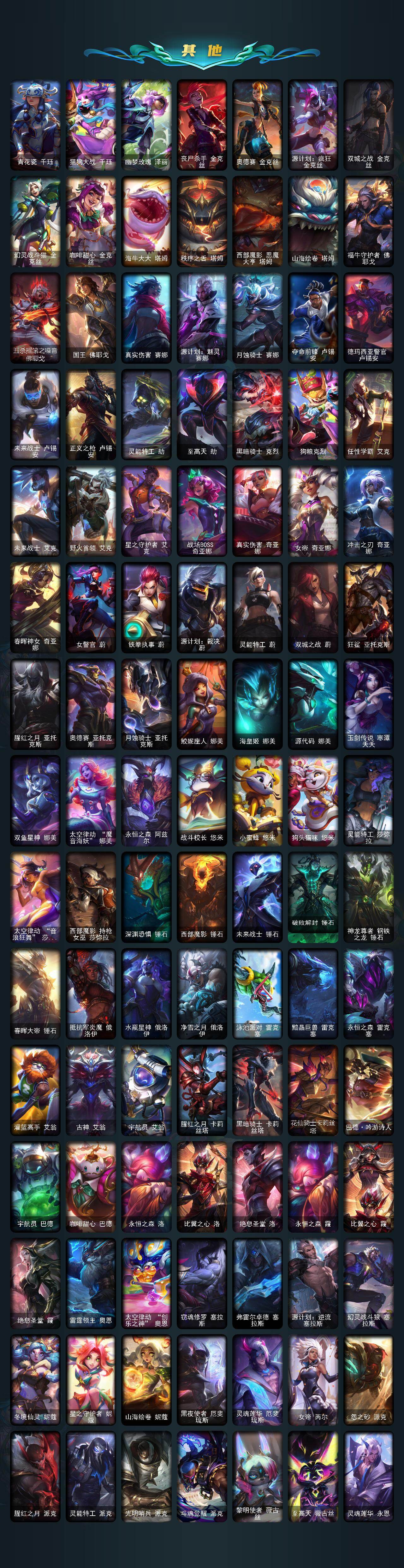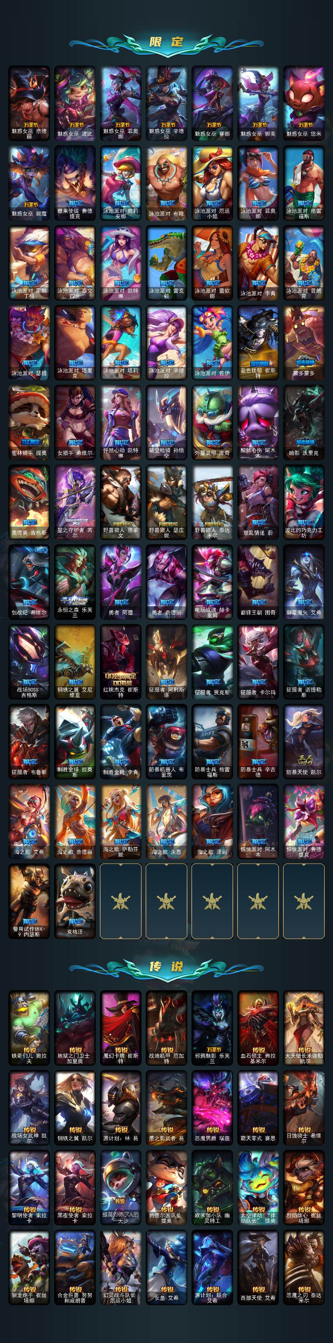 【神话皮肤】:十周年纪念安妮,源代码乐芙兰,殿堂传奇乐芙兰,十五周年纪念希维尔,新卧虎藏龙贾克斯,神凰行者瑞羽圣凰艾尼维亚,水晶圣骑蕾欧娜,水晶巫灵泽拉斯,星之守护者塔莉垭,海克斯科技阿利斯塔,海克斯科技安妮,海克斯科技崔丝塔娜,海克斯科技嘉文
