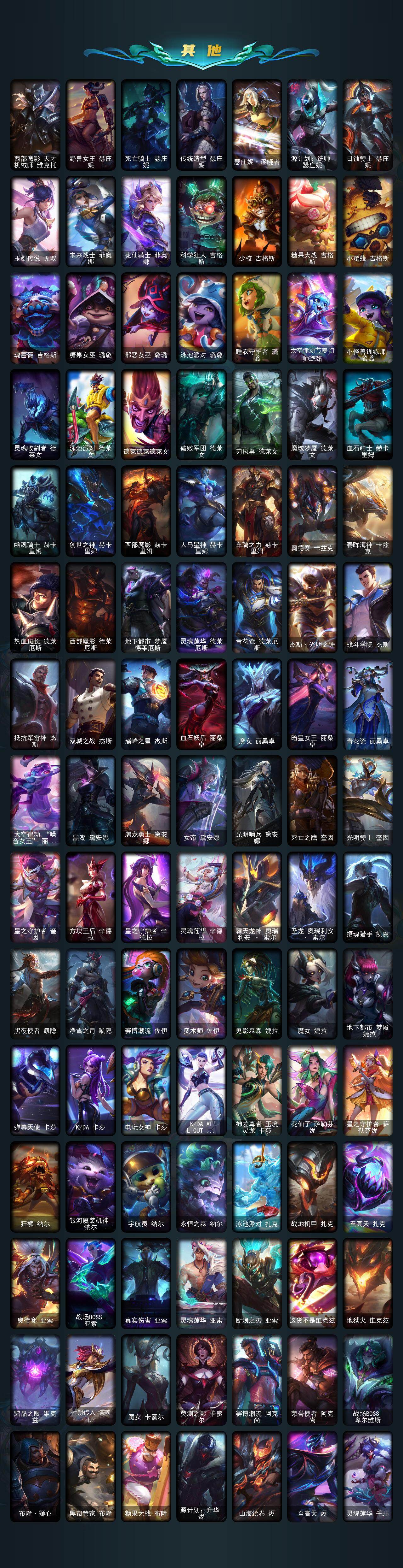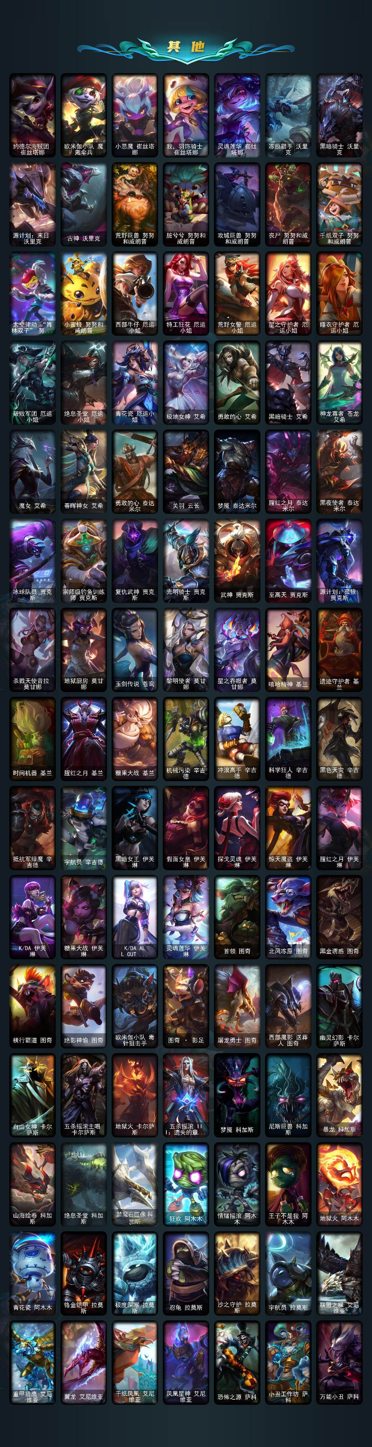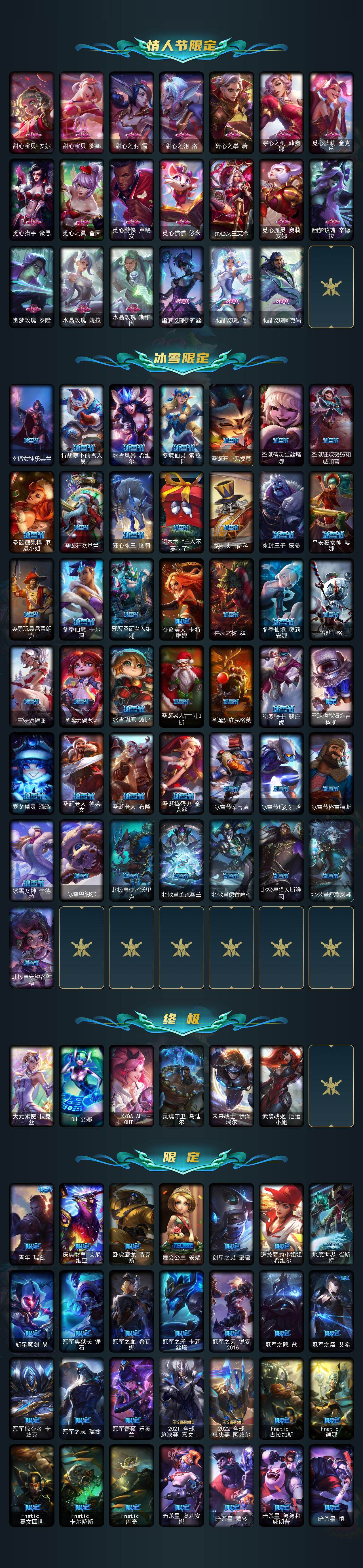 【神话皮肤】:十周年纪念安妮,源代码乐芙兰,殿堂传奇乐芙兰,十五周年纪念希维尔,新卧虎藏龙贾克斯,神凰行者瑞羽圣凰艾尼维亚,水晶圣骑蕾欧娜,水晶巫灵泽拉斯,星之守护者塔莉垭,海克斯科技阿利斯塔,海克斯科技安妮,海克斯科技崔丝塔娜,海克斯科技嘉文