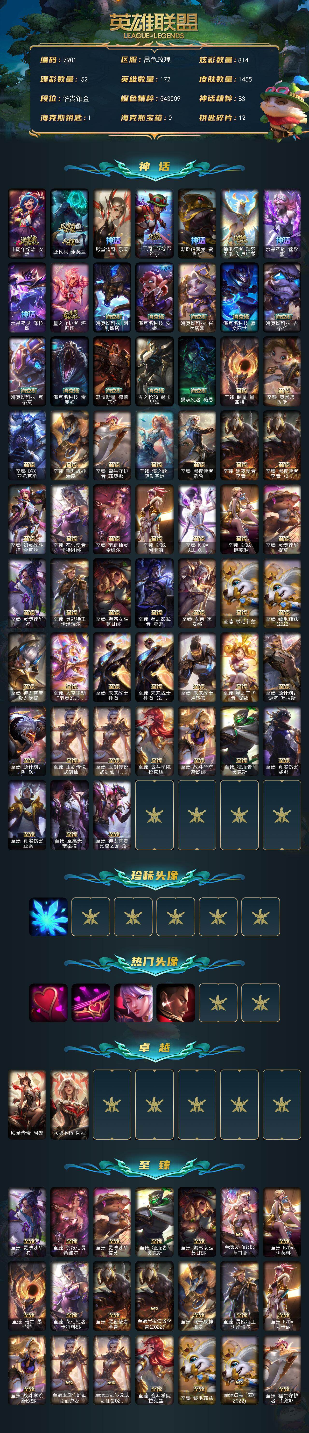 【皇冠号,签名阿狸,,龙瞎炫彩见龙在田,,乘龙御天】铂金段位-172英雄-1455皮肤-814炫彩-8终极-60神话-303限定-118传说-215史诗