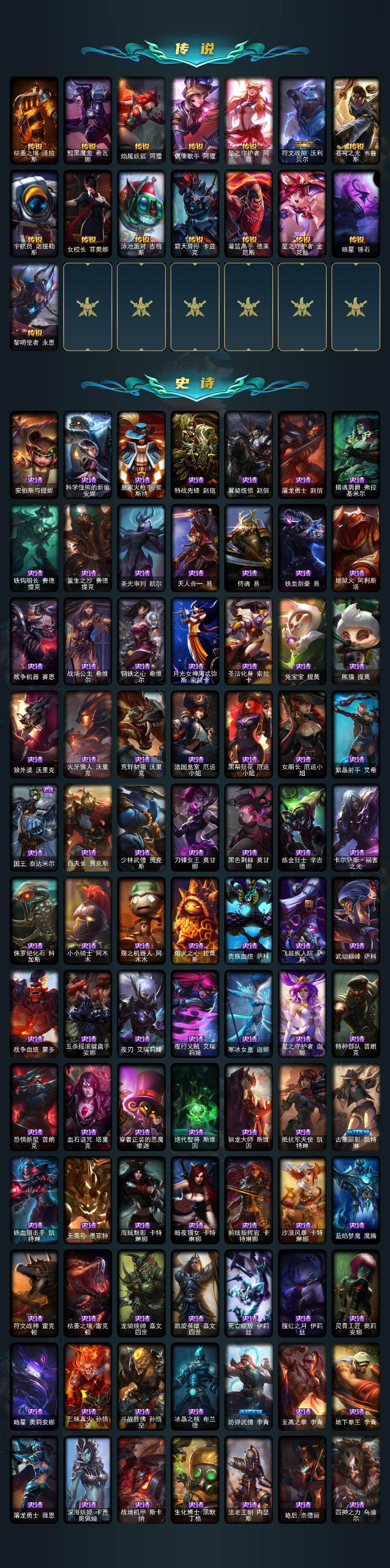 【神话皮肤】:十周年纪念安妮,十五周年纪念希维尔,暗星科加斯,海克斯科技阿利斯塔,海克斯科技阿木木,海克斯科技波比,海克斯科技嘉文四世,海克斯科技吉格斯,海克斯科技克格莫,海克斯科技拉莫斯,海克斯科技斯维因,恐惧新星德莱厄斯,零之枪骑赫卡里姆,摄魂使者薇恩,新创战纪希维尔,至臻真实伤害赛娜,至臻灵能特工