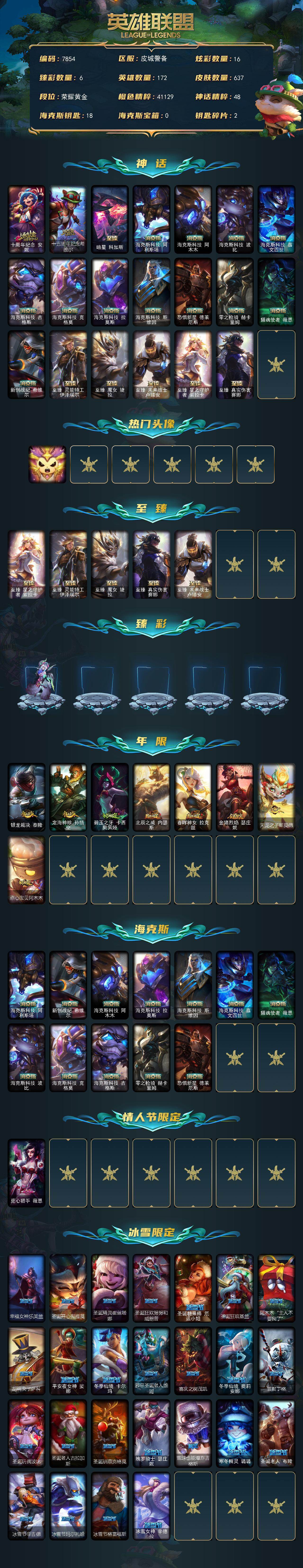 黄金段位-172英雄-637皮肤-16炫彩-3终极-20神话-90限定-57传说-178史诗