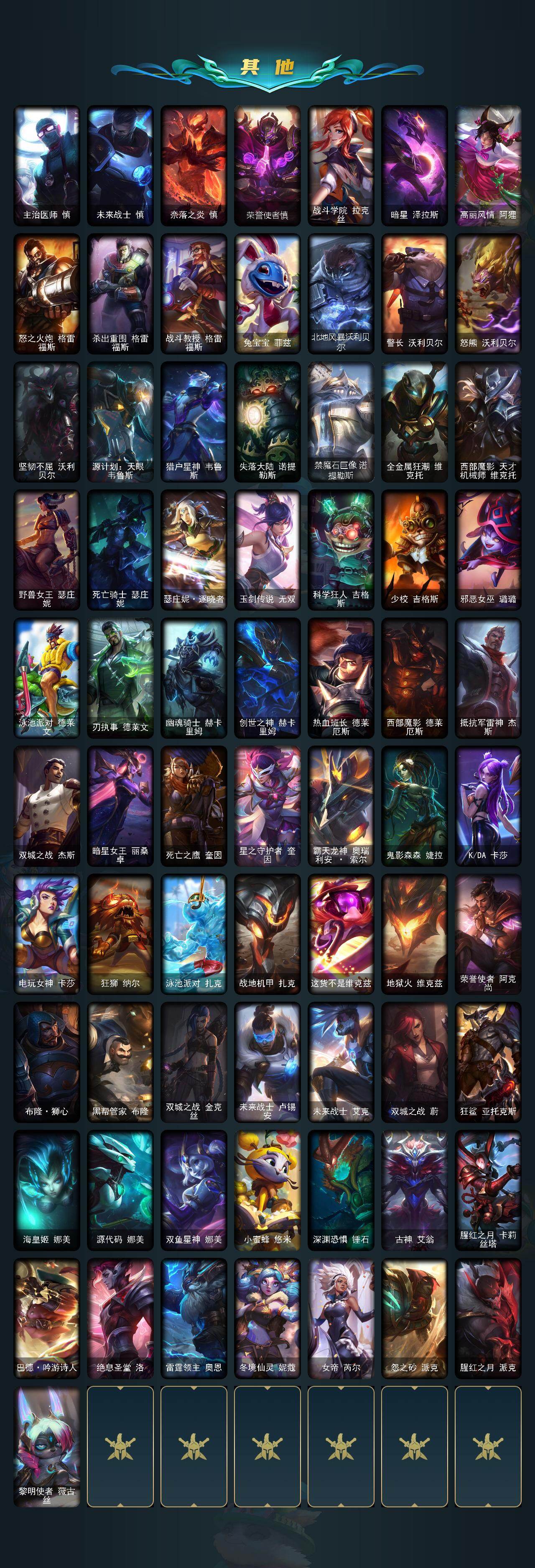 【神话皮肤】:十周年纪念安妮,源代码乐芙兰,殿堂传奇乐芙兰,暗星科加斯,神凰行者瑞羽圣凰艾尼维亚,海克斯科技嘉文四世,海克斯科技吉格斯,海克斯科技克格莫,海克斯科技玛尔扎哈,恐惧新星德莱厄斯,摄魂使者薇恩,至臻真实伤害奇亚娜,至臻真实伤害奇亚娜2022,至臻真实伤害赛娜,至臻青花瓷千珏,至臻暗星墨