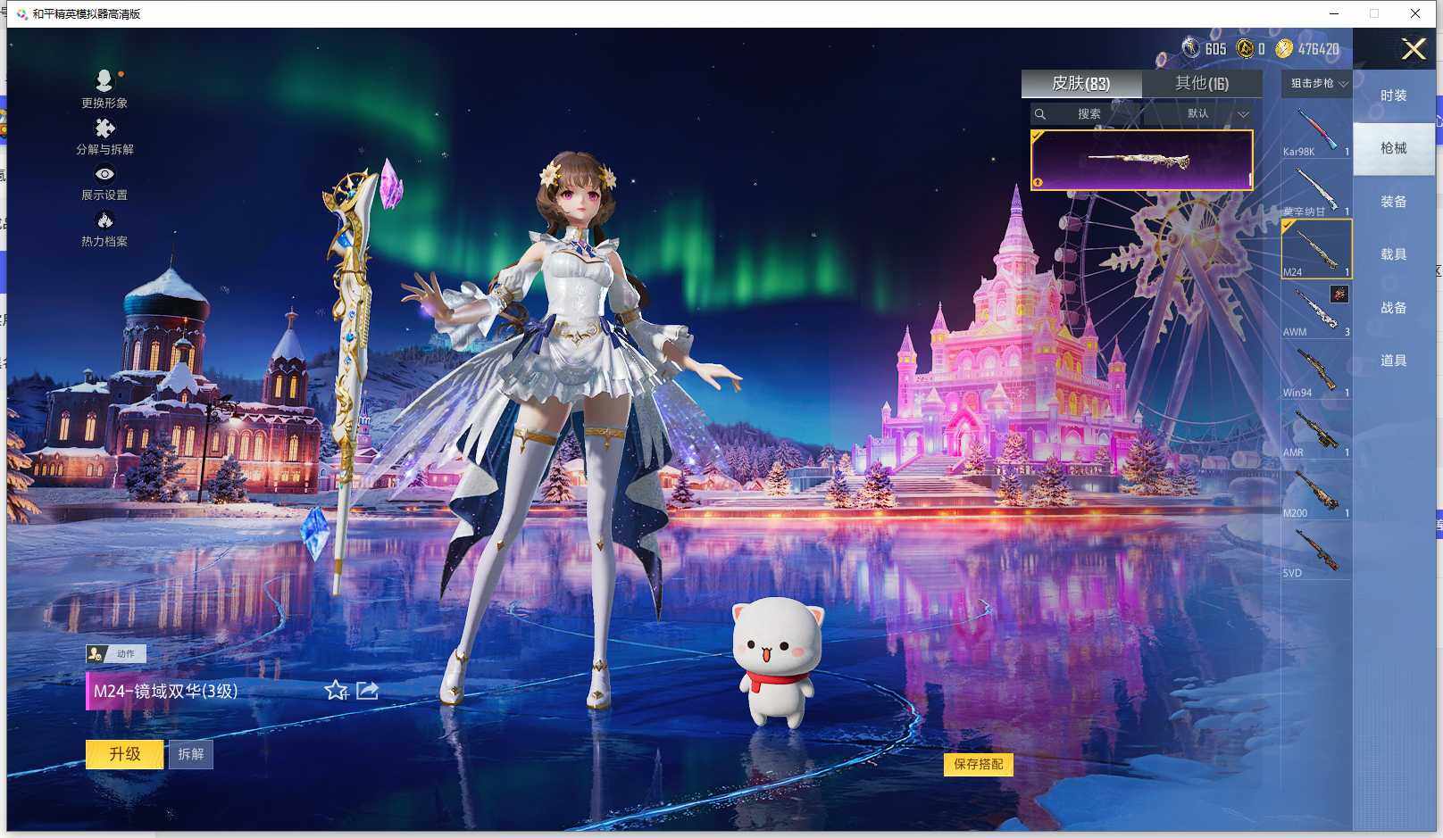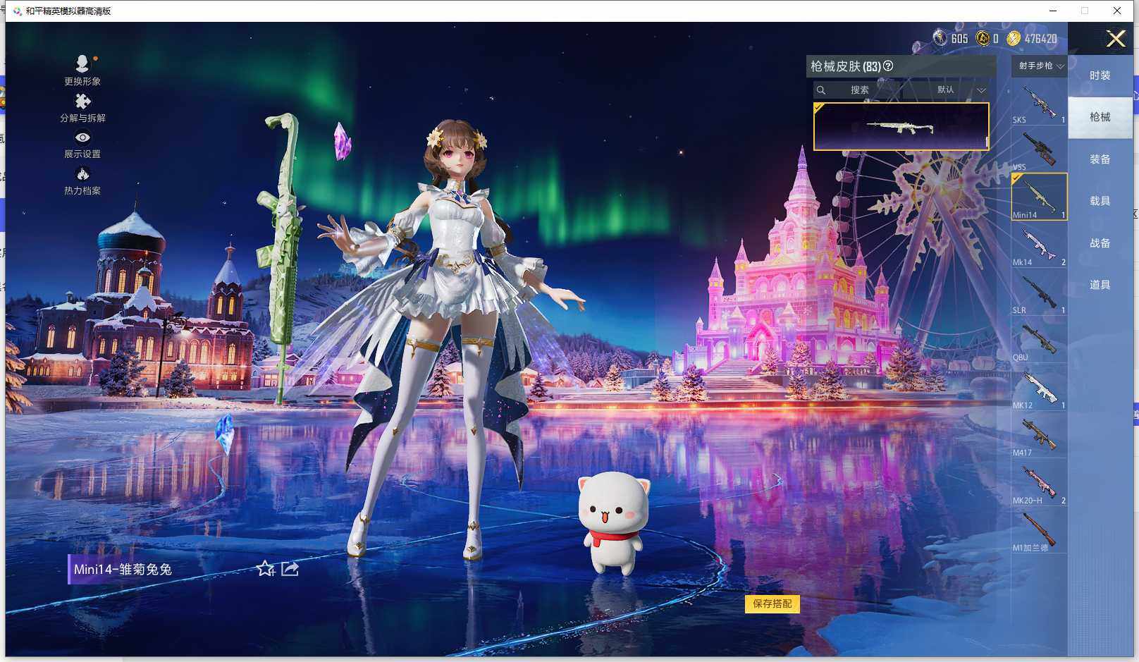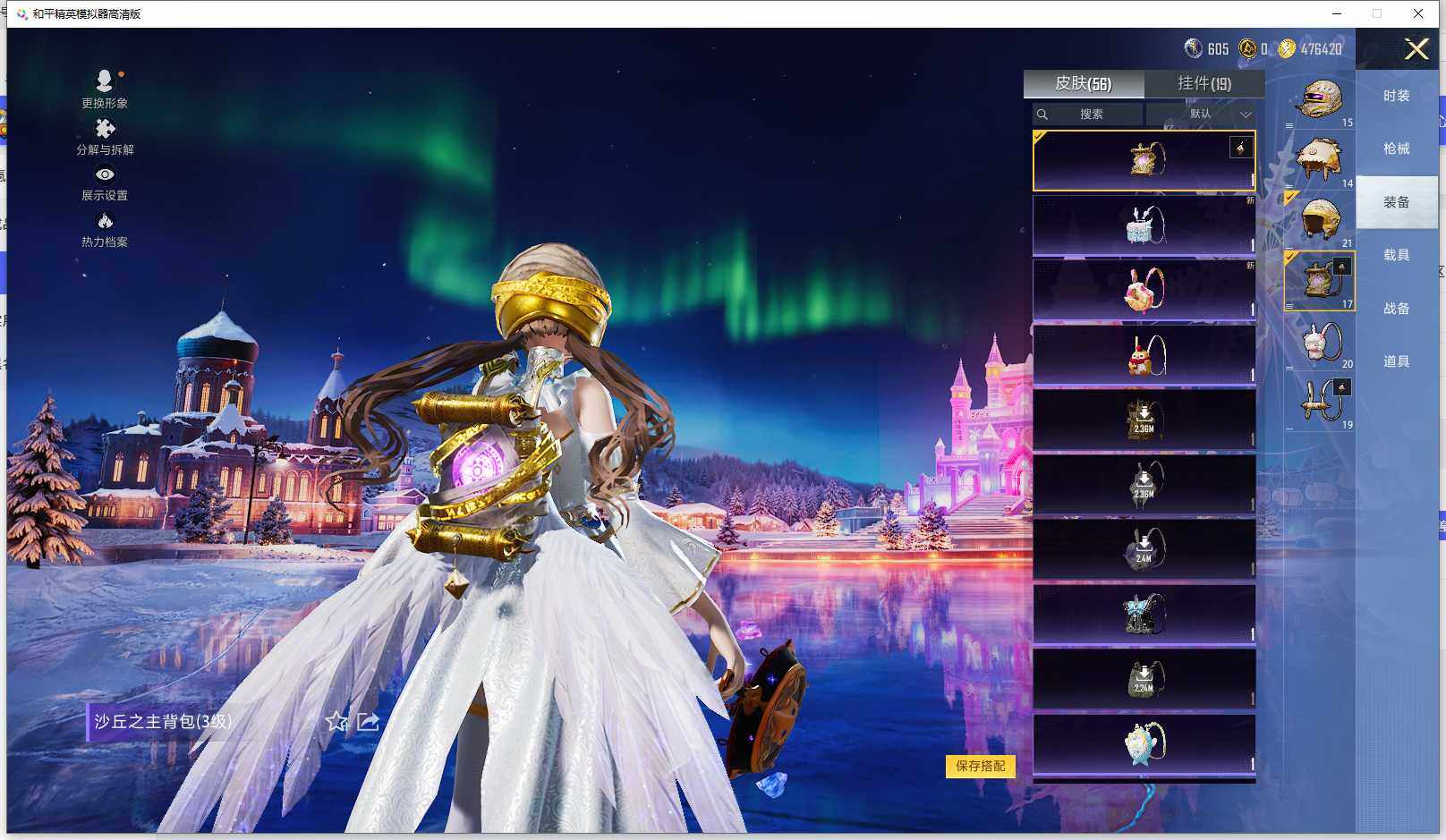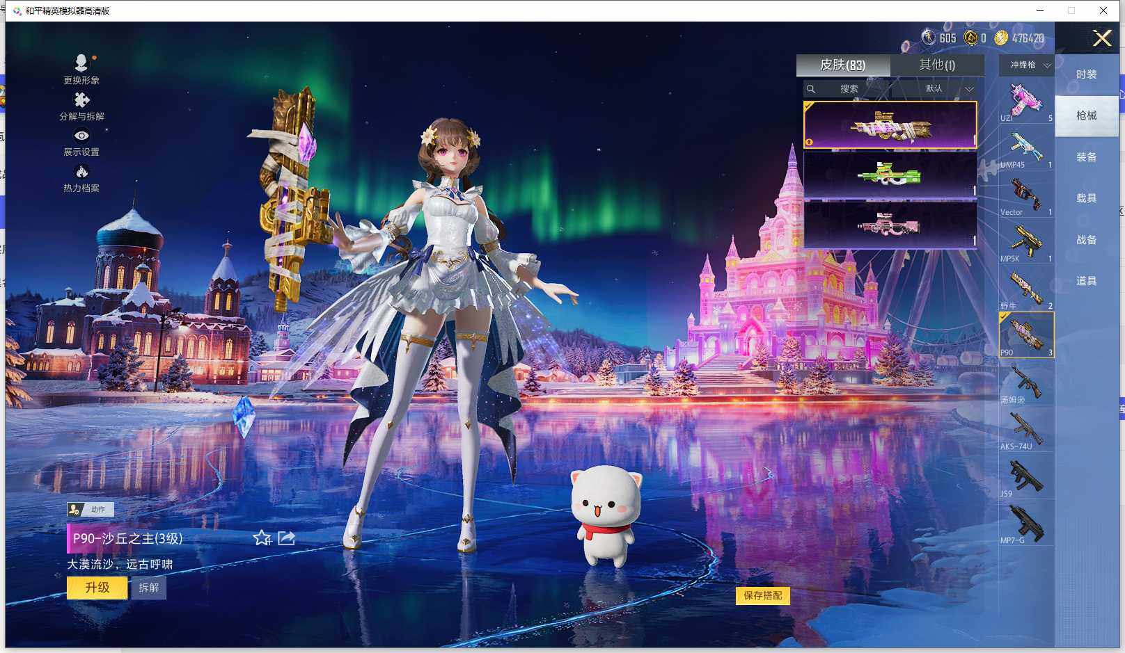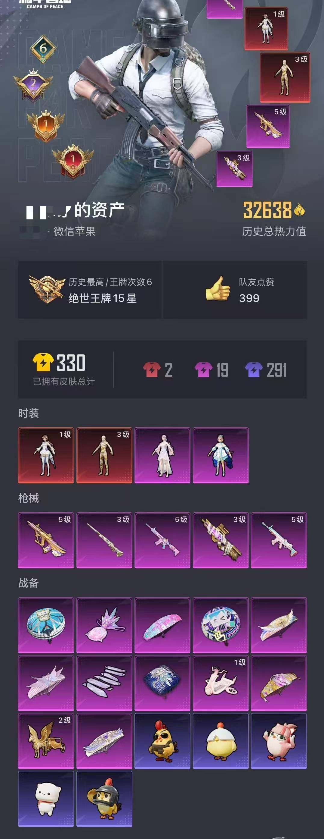 时装数: 53 枪械数: 83 战备数: 71 神级装扮: 沙丘之主-图卡盟,镜域双华-欧若拉 热门装扮: 洛天依,烟云彩露 稀有枪皮: 五级M416-电玩时刻,五级SCAR-L-锦绣绵绵,五级AUG-圣斗士星矢,三级M24-镜域双华,三级P90-沙丘之主
