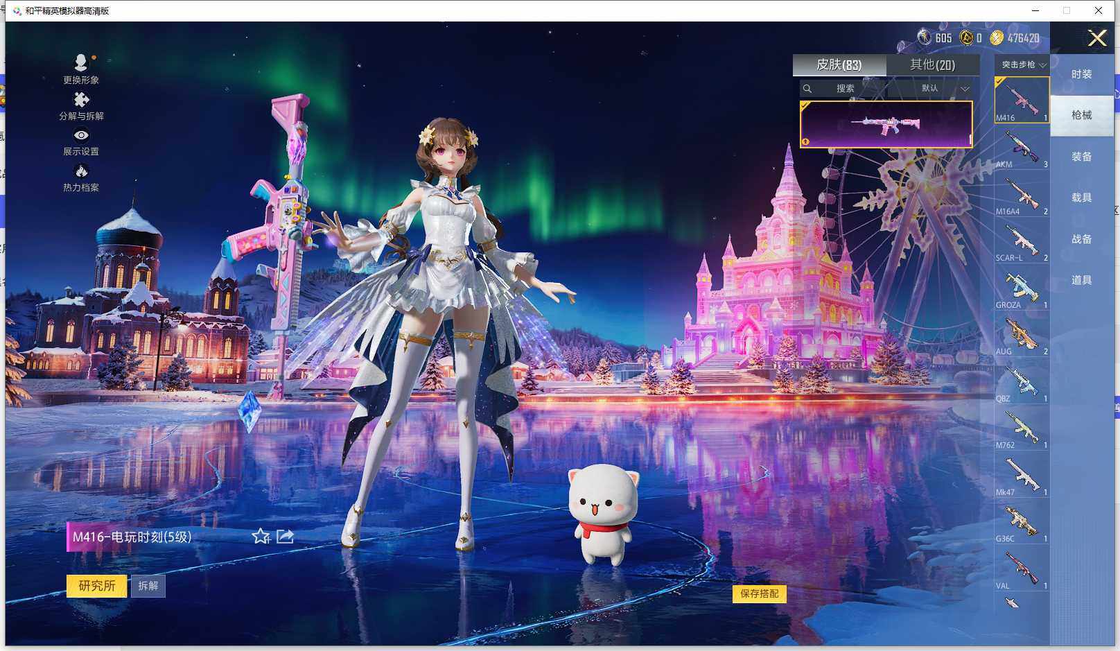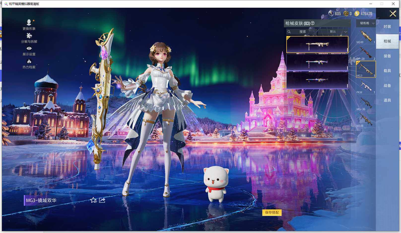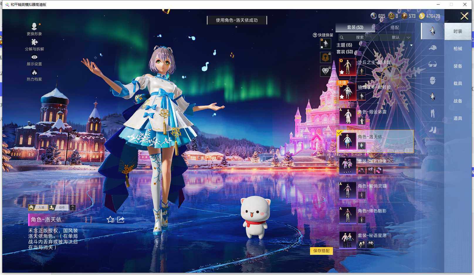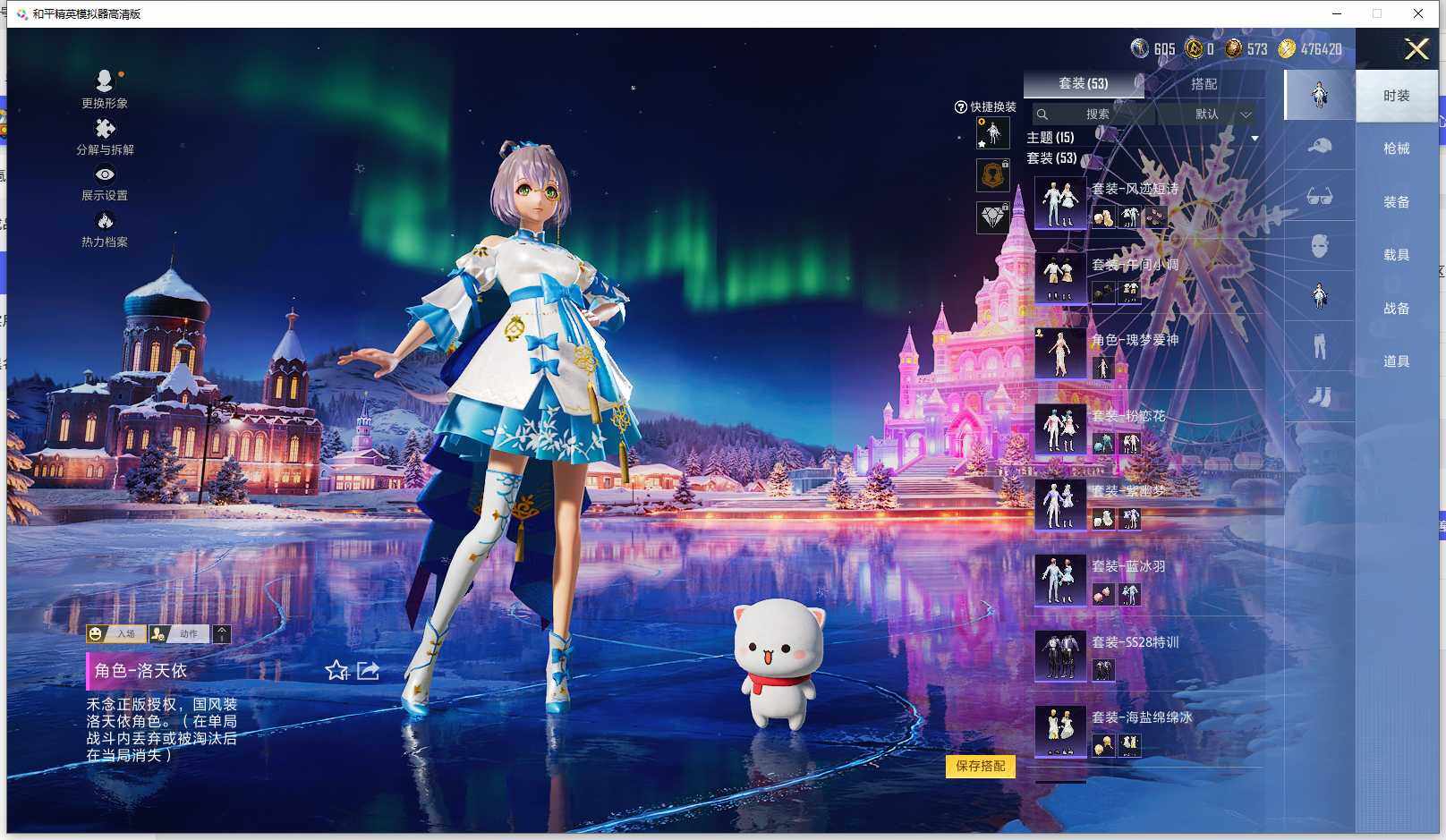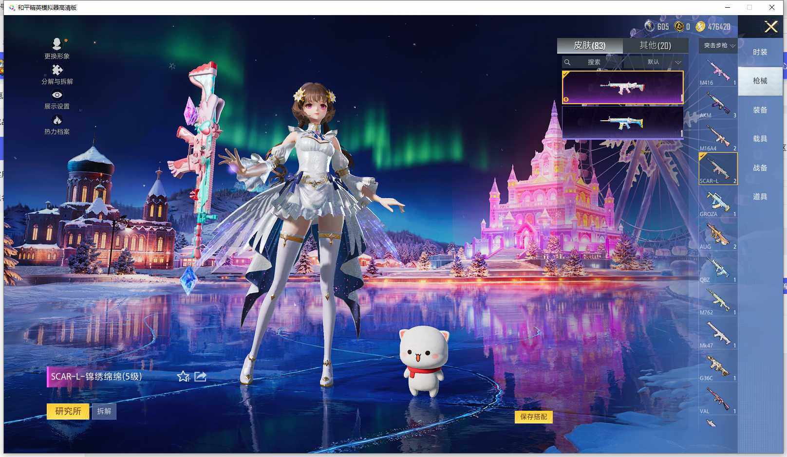 时装数: 53 枪械数: 83 战备数: 71 神级装扮: 沙丘之主-图卡盟,镜域双华-欧若拉 热门装扮: 洛天依,烟云彩露 稀有枪皮: 五级M416-电玩时刻,五级SCAR-L-锦绣绵绵,五级AUG-圣斗士星矢,三级M24-镜域双华,三级P90-沙丘之主
