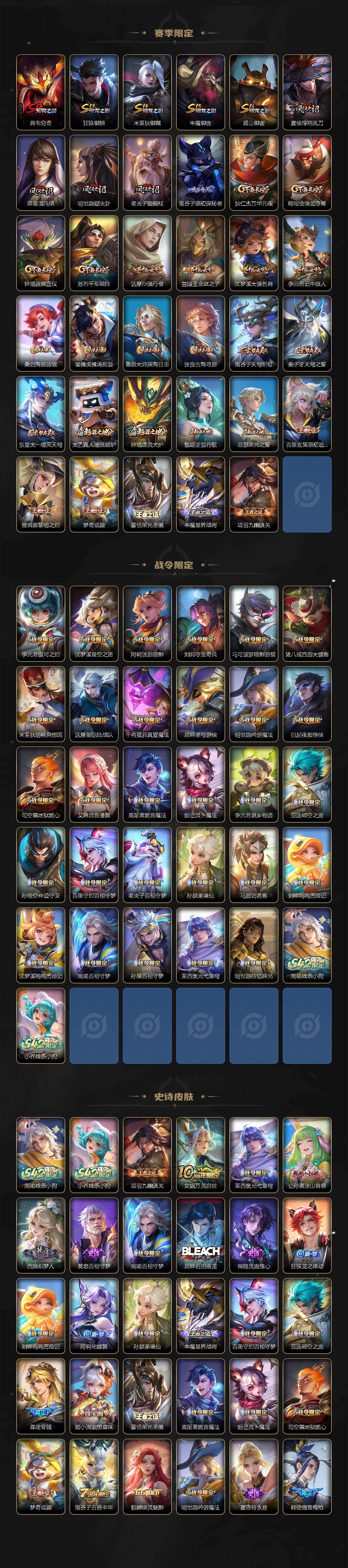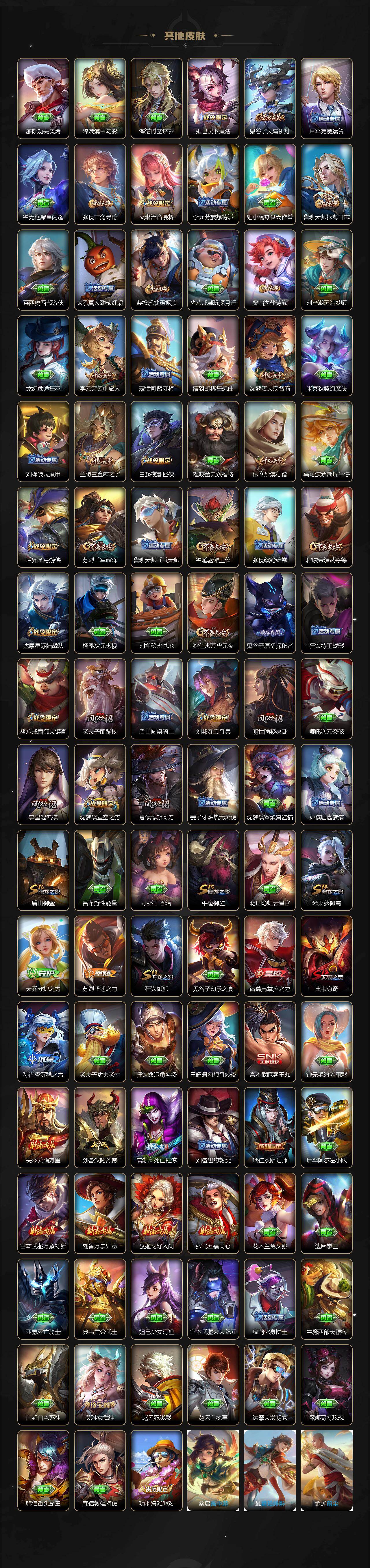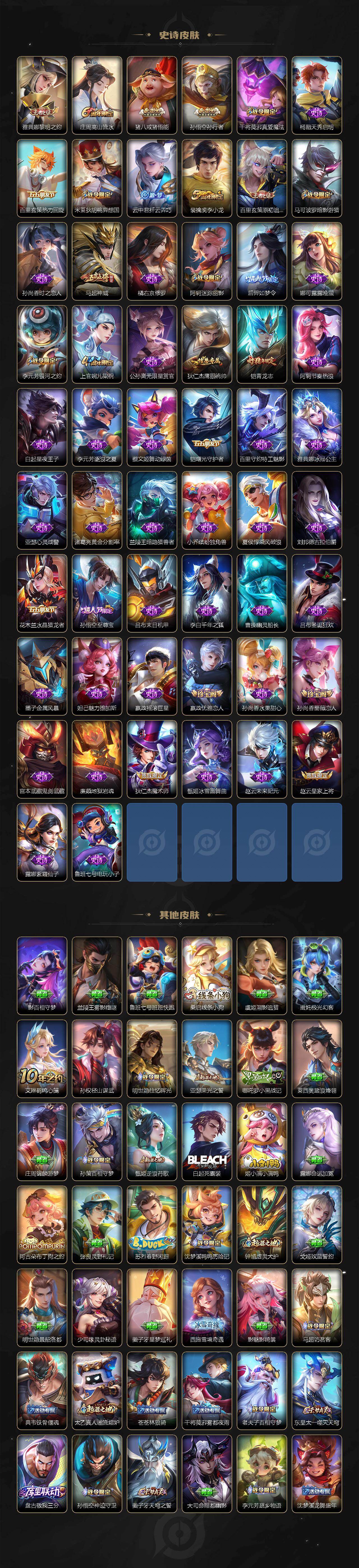 后羿神树通天/司空震-愿照·山河定/澜-愿照·九州拓/裴擒虎-祥瑞亨通/桑启-鸣野蒿/马超-琥珀纪元/马超-无双飞将/镜-炽阳神光/刘备-时之恋人/梦奇-胖达荣荣/孙尚香-末日机甲/宫本武藏-地狱之眼/暃-埋骨钱/姜子牙-天穹之誓/狄仁杰-阴阳师/赵云-皇家上将/嬴政-优雅恋人/孙尚香-蔷薇恋人/庄周-高山流水/高渐离-死亡摇滚/阿轲-迷踪丽影/白起-夜都怪侠/夏侯惇-朔风刀/典韦-穷奇/