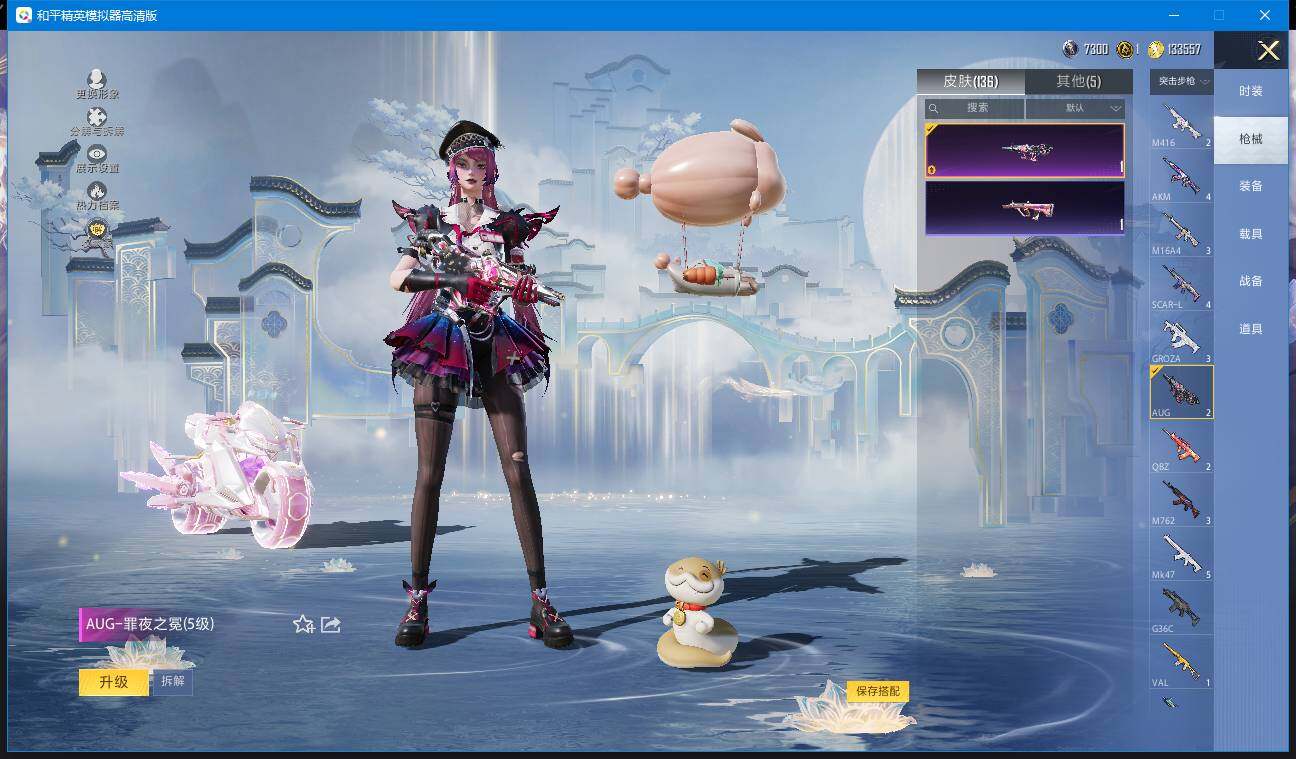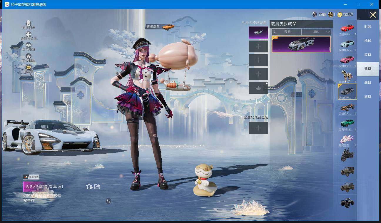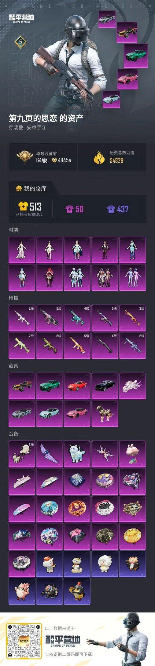 时装数: 366 载具数: 9 枪械数: 136 战备数: 96 热门装扮: 奇异狩猎者,梦幻火箭(新101),呆萌铁蟹,深海小丑鱼,迅捷狂鲨,好奇恐龙,洛天依,银红美神,幻彩电音,绯穹魔姬,异瞳寒姬,罪夜之冕,小舞,小舞·雪昙 载具: 僚机-萌兔起飞,玛莎拉蒂Quattroporte(夜幕蓝),宝马X6 M(曼岛绿),迈凯伦塞纳(冷萃蓝),迈凯伦F1车队 MCL38(木瓜橙),最终圣卫者摩托车