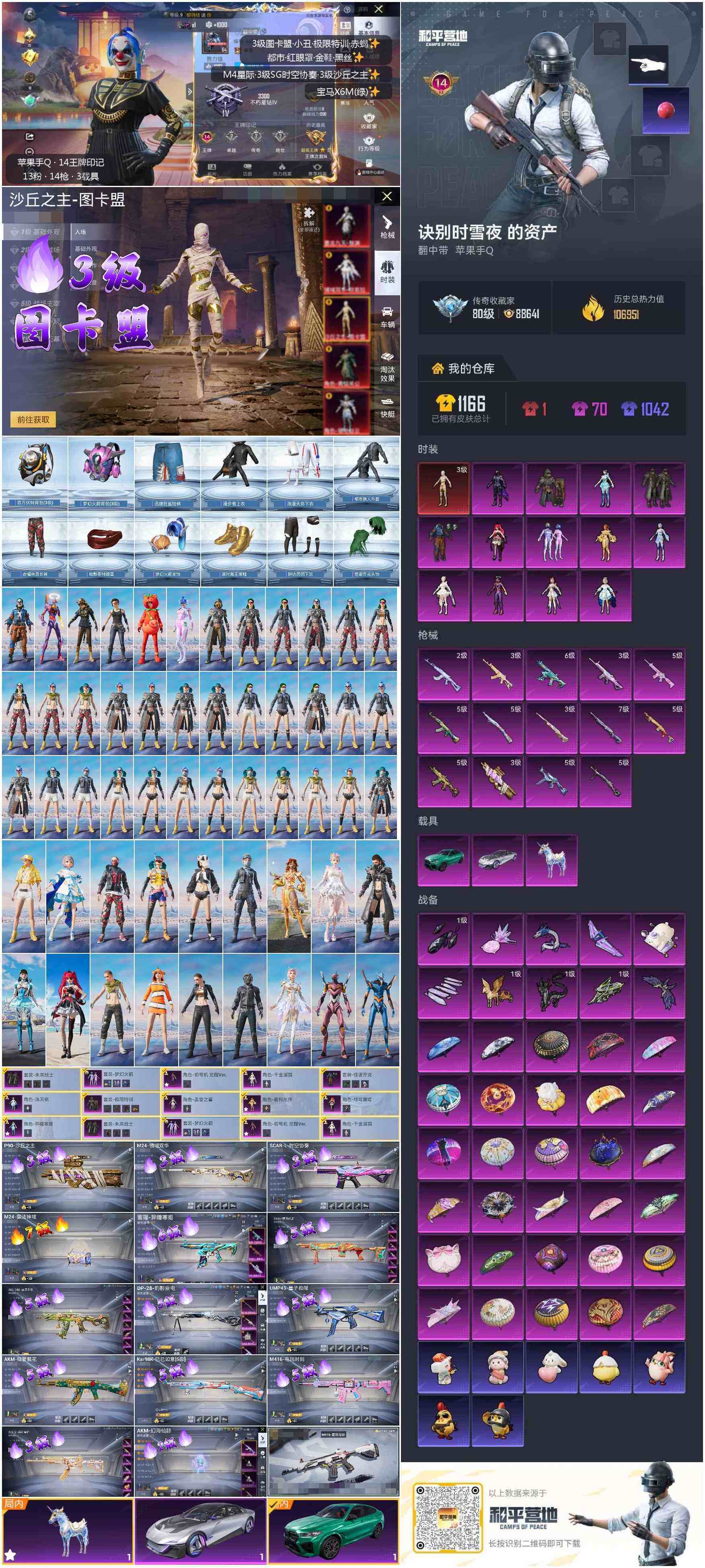 A1975苹果 手Q-1神装-13粉装-14特效枪-3载具-10粉色飞行器-106951热力值-14王牌印记-252套装-316枪皮