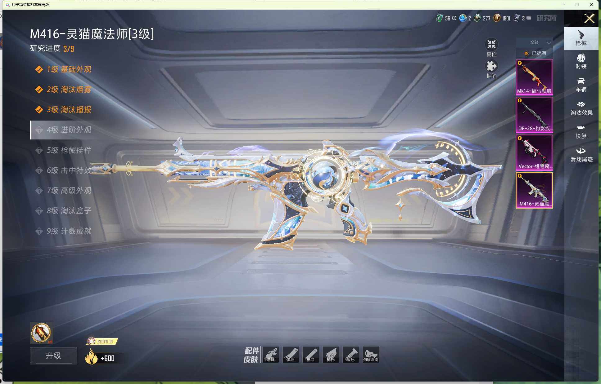【粉色枪皮等级】:M416-灵猫魔法师(三级),Vector-绯穹魔姬(七级),Mk14-福马献瑞(五级),DP-28-豹影疾电(五级)