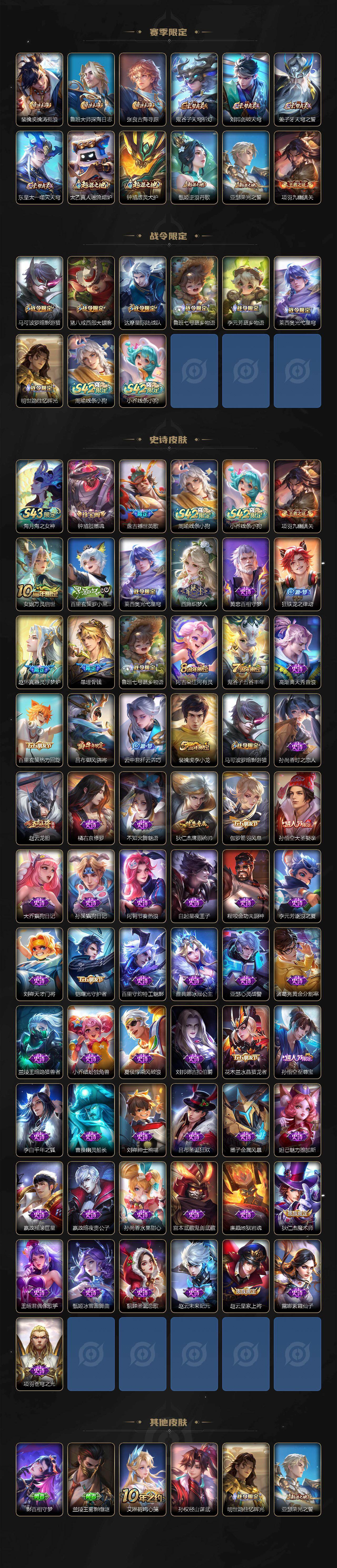 【传说皮肤】:阿轲罗刹妄海,云缨神骥越千峰,狄仁杰神骥赴朔漠,马超神骥逐星野,司空震愿照山河定,云缨幻光神枪,桑启鸣野蒿,亚连落雪白狼,孙策乘龙淬吴钩,铠绛天战甲,孙悟空零号赤焰,李信一念神魔,干将莫邪久胜