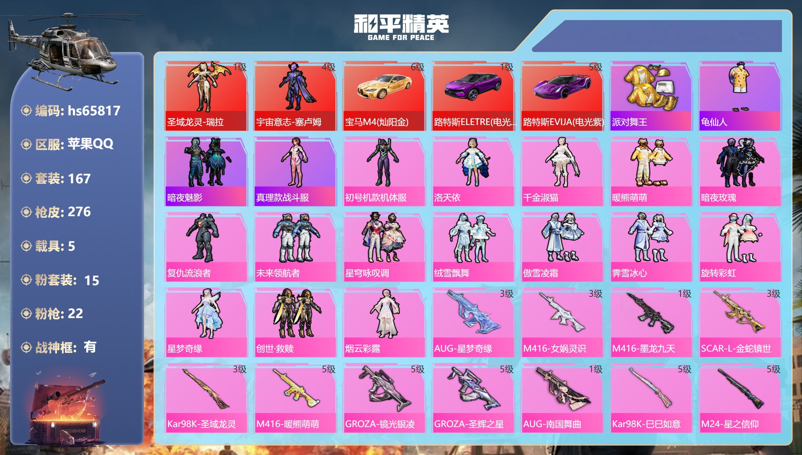 [17834962]实名: 可修改 时装数: 629 载具数: 8 枪械数: 265 战备数: 8 神级装扮: 沙丘之主-图卡盟,幽焰骑士-维塔 ,盛世惊鸿-云鸾 热门装扮: 梦幻火箭(新101),数码大师,迅捷狂鲨,缤纷油彩,霞光圣骑,寒光使者,冰川红玫,暗夜行者,恶魔喵喵,胖达团团,心之回忆,黄族统领,美雪,美琪,创世·救赎,初号机 觉醒Ver.,风幻水境,时空协奏·回响,千金淑猫,萨利娅,