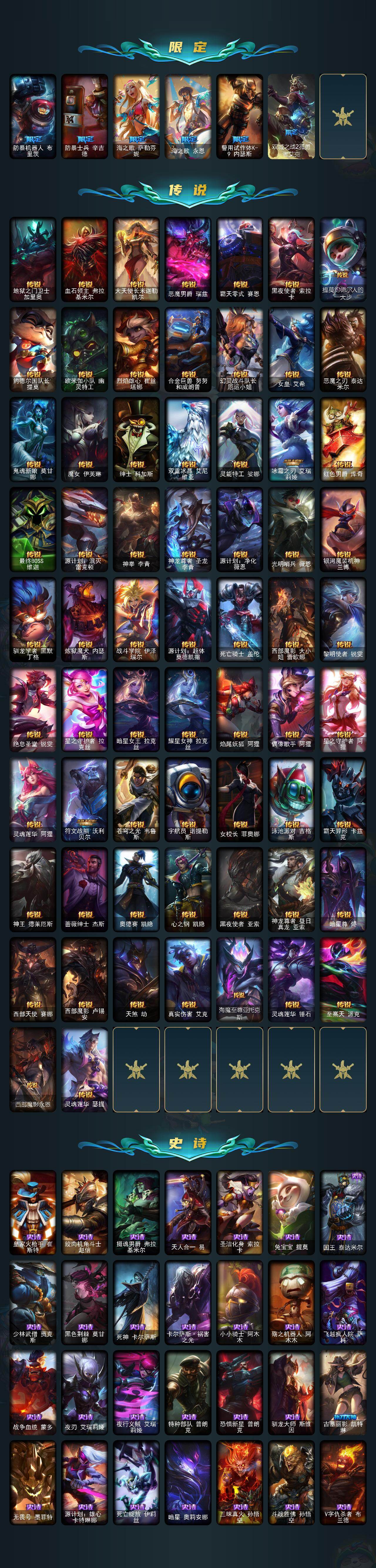 【神话皮肤】:十周年纪念安妮,殿堂传奇乐芙兰,十五周年纪念希维尔,殿堂传奇薇恩,创世黑夜使者亚索,星之守护者塔莉垭,灰烬骑士派克