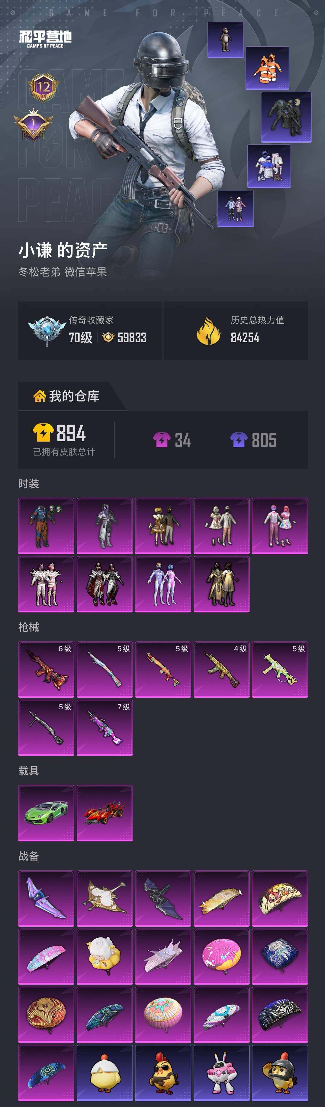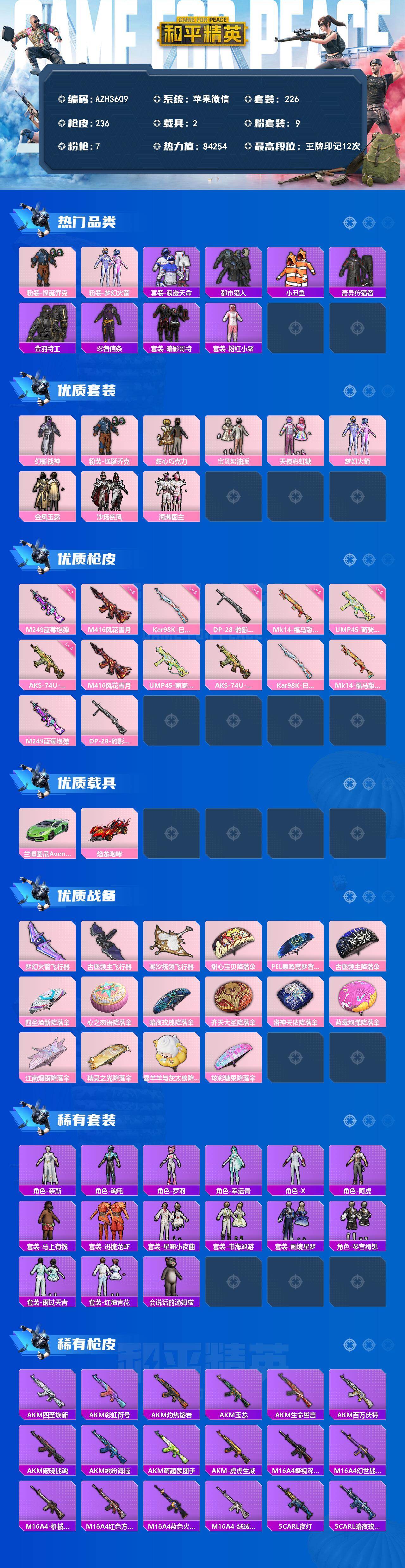 【AZH3609】苹果 微信【怪诞乔克都市巧克力三姐妹梦幻火箭幻影战神 满级蓝莓炮弹M249 酷熊背包 2载具】9粉装-7特效枪-2载具-3粉色飞行器-84254热力值-12王牌印记-226套装-236枪皮