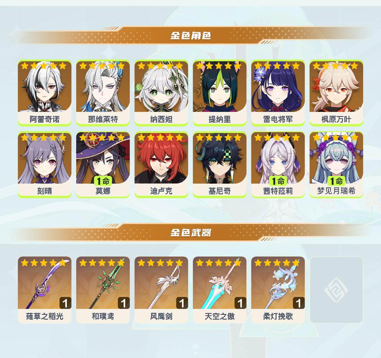 【YSX1812】56级/20黄/女主/12个五星角色/5个五星武器/0命那维莱特/0命枫原万叶/1命茜特菈莉/0命基尼奇/0命雷电将军/0命纳西妲/0命阿蕾奇诺/0命提纳里/1命莫娜/0命迪卢克/0命刻晴/1命梦见月瑞希/精1薙草之稻光/精1和璞鸢/精1风鹰剑/精1柔灯挽歌/精1天空之傲