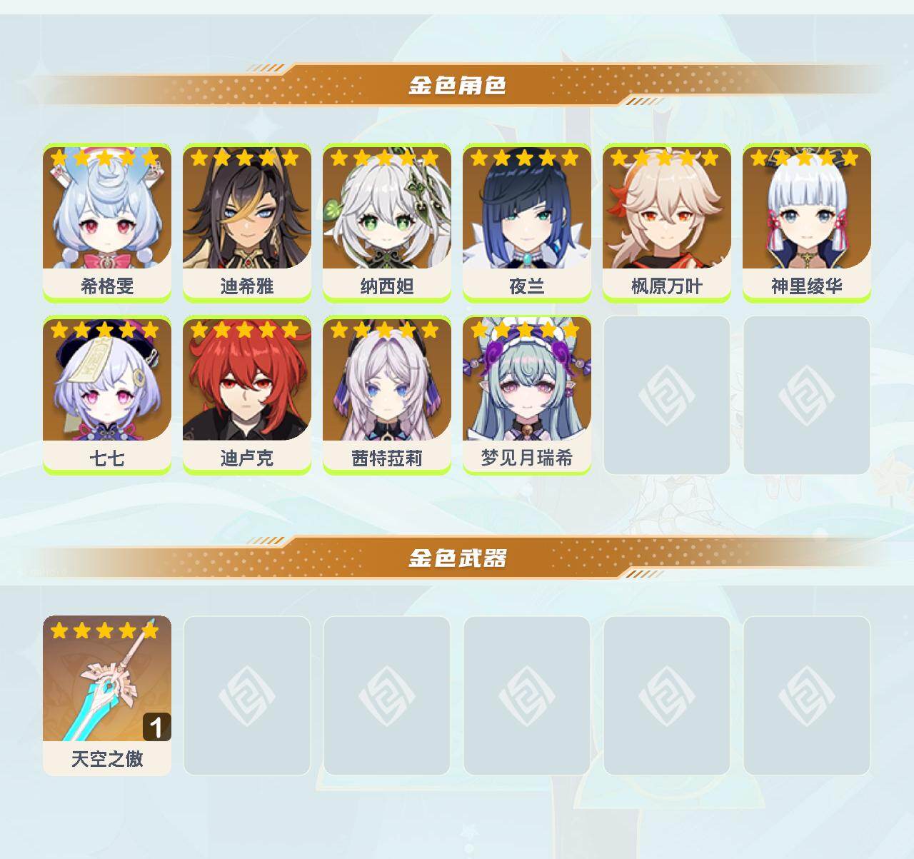 【YSZ3257】50级/11黄/女主/10个五星角色/1个五星武器/0命神里绫华/0命夜兰/0命枫原万叶/0命梦见月瑞希/0命迪卢克/0命茜特菈莉/0命纳西妲/0命希格雯/0命七七/0命迪希雅/精1天空之傲
