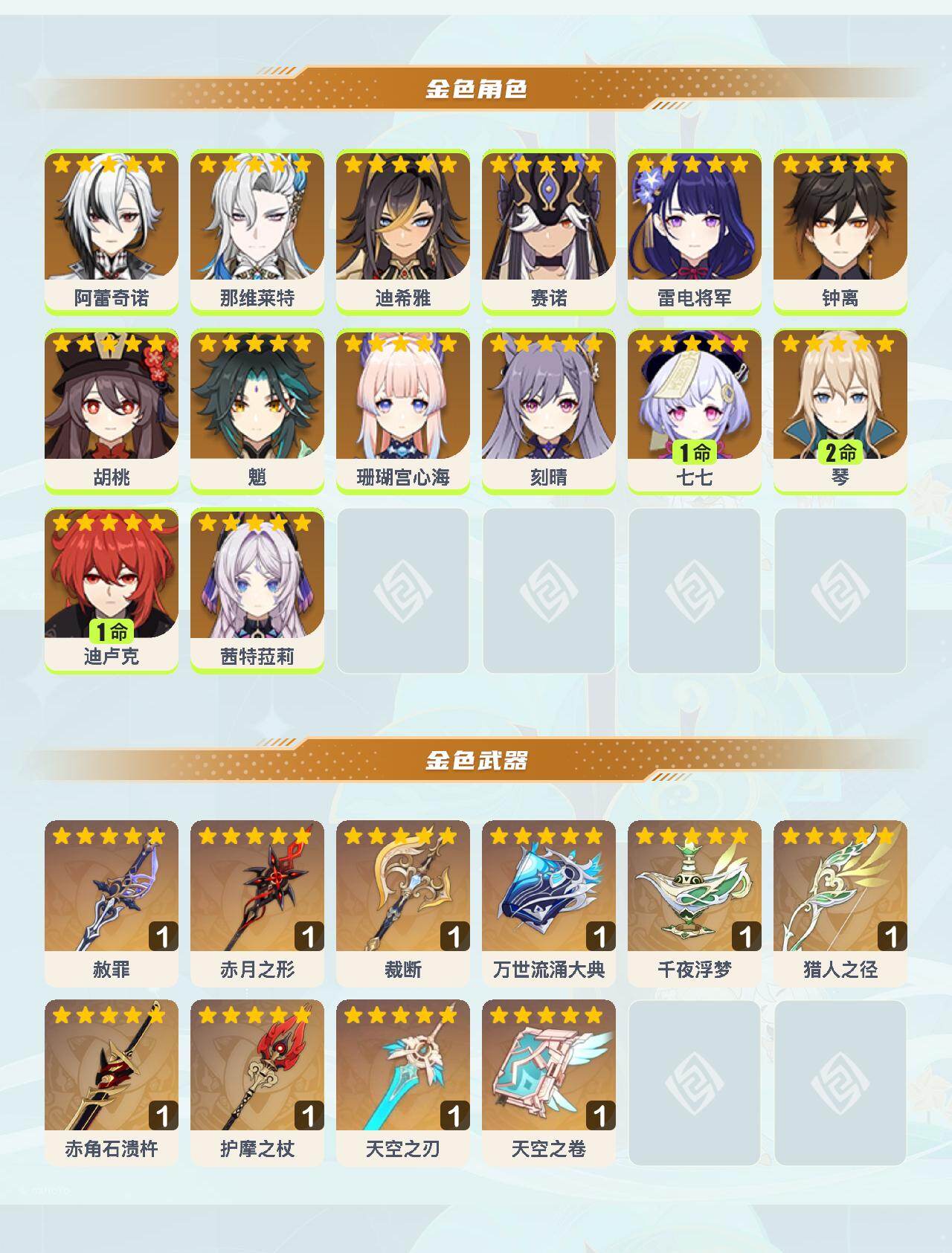【YSYT1112】58级/28黄/女主/14个五星角色/10个五星武器/0命胡桃/0命那维莱特/0命茜特菈莉/0命雷电将军/0命钟离/0命赛诺/0命魈/0命刻晴/0命珊瑚宫心海/0命阿蕾奇诺/1命迪卢克/1命七七/2命琴/0命迪希雅/精1万世流涌大典/精1护摩之杖/精1赤月之形/精1赤角石溃杵/精1千夜浮梦/精1猎人之径/精1天空之卷/精1裁断/精1赦罪/精1天空之刃