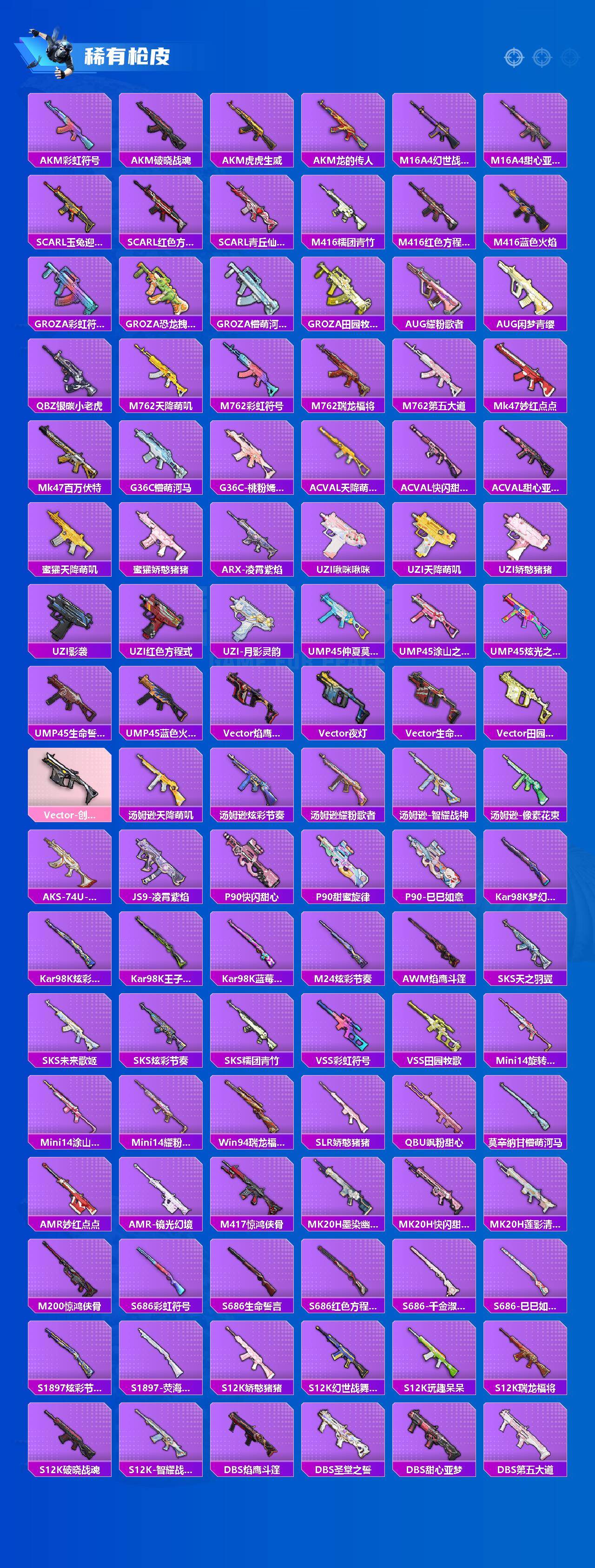 【粉色枪皮等级】:SCAR-L-锦绣绵绵(五级),M416-五爪金龙(五级),GROZA-镜光银凌(五级),AUG-超新星(七级)