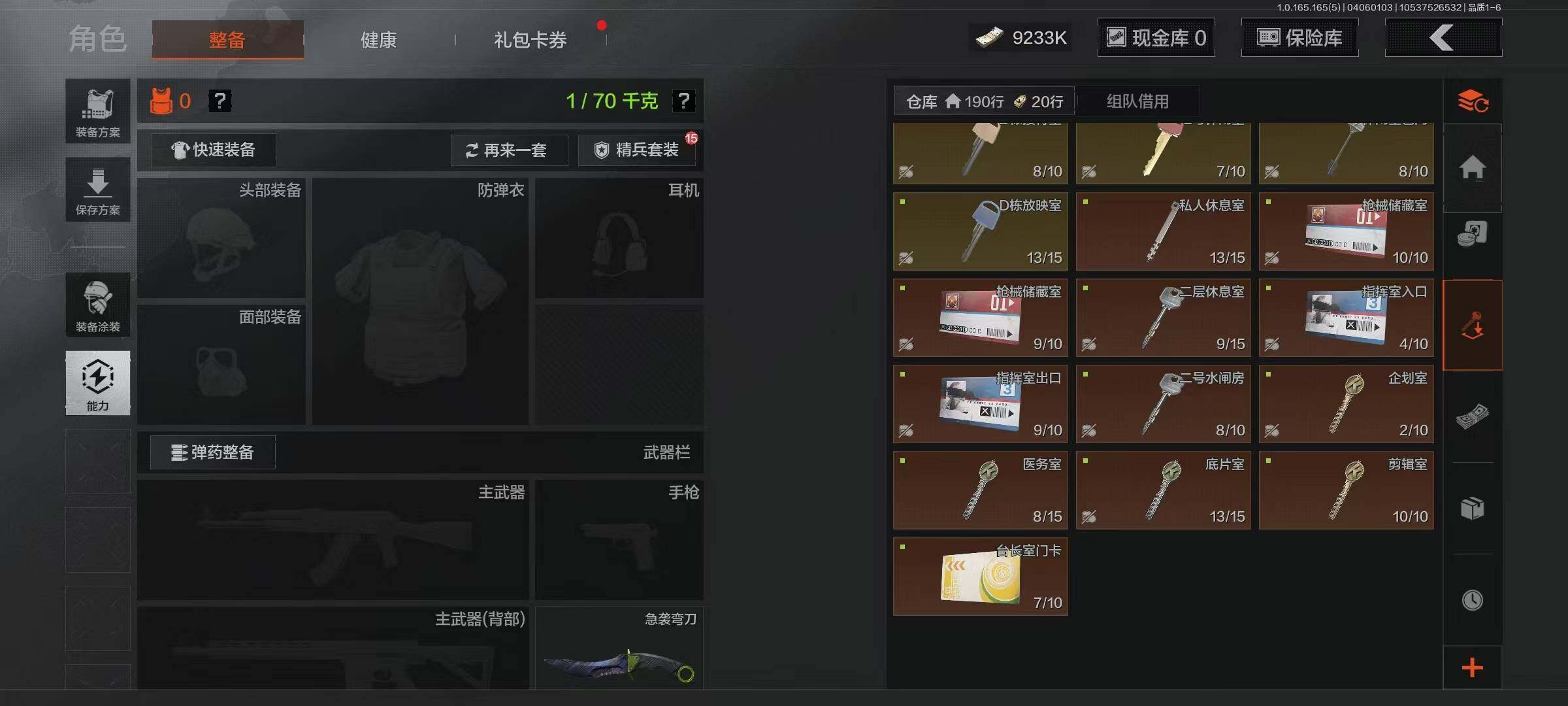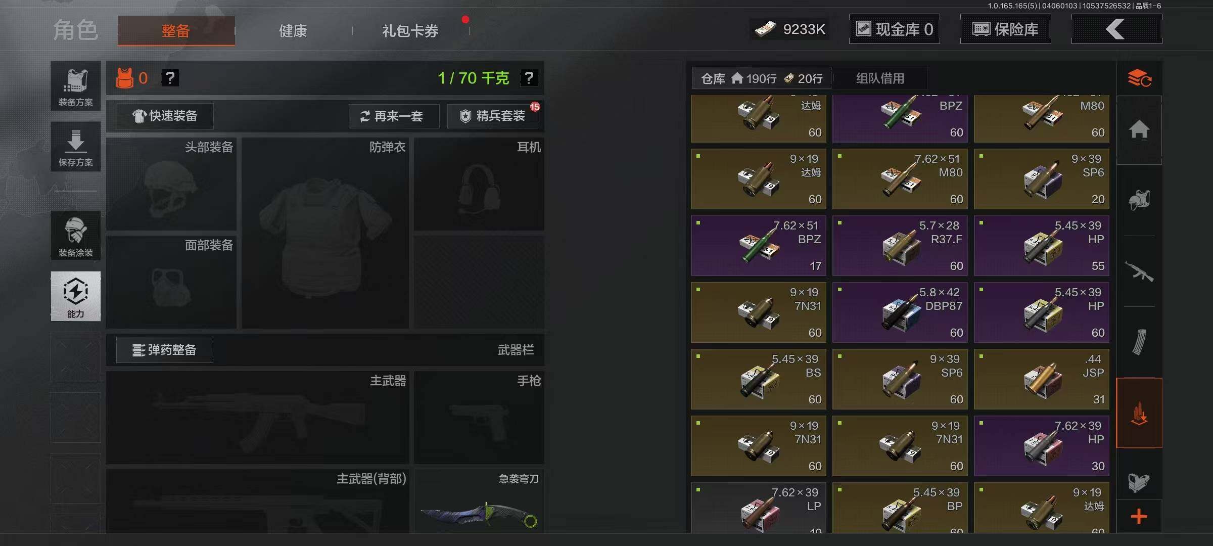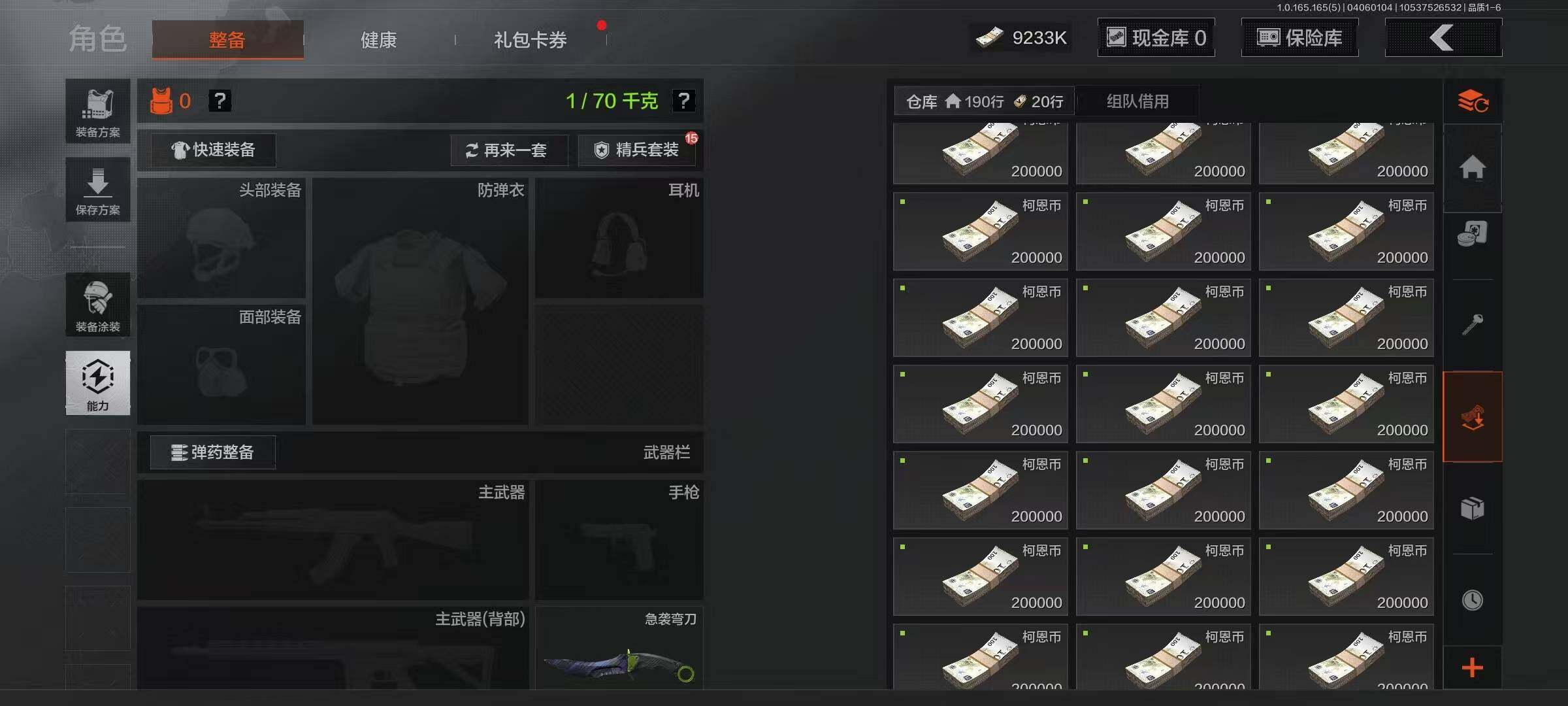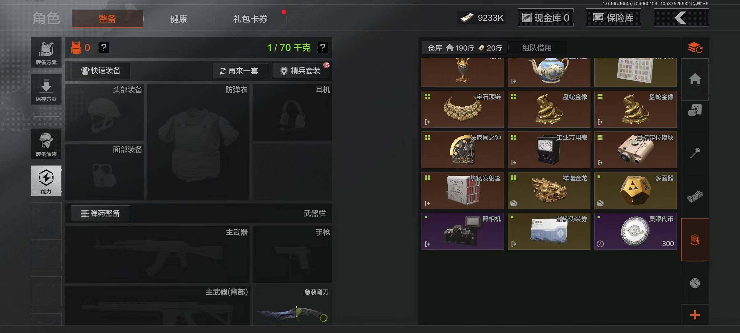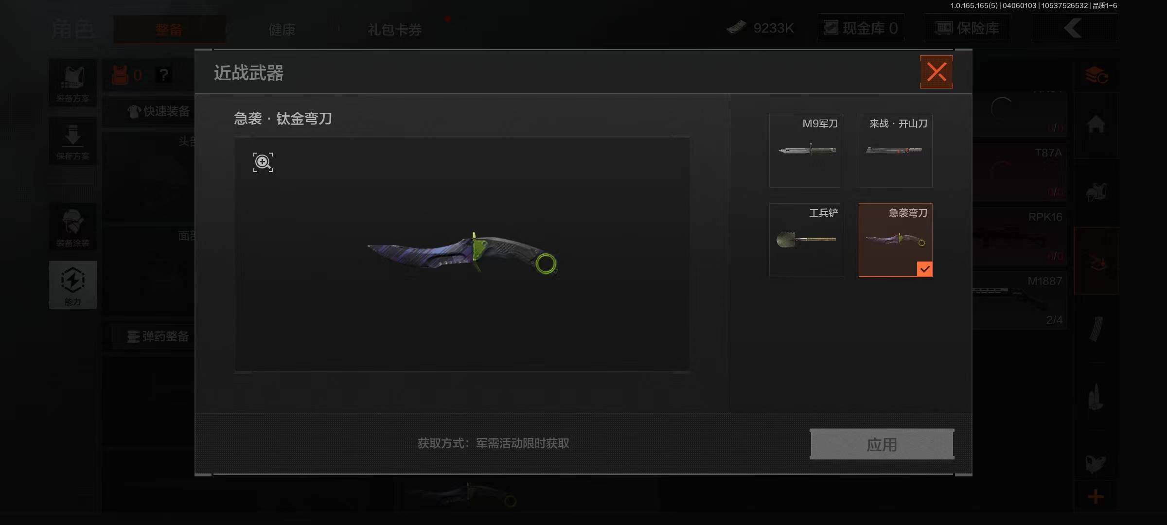 【AQZ397】段位:大师/仓库价值(百万):32.1/柯恩币:9233/工兵铲/来战开山刀/急袭弯刀/钢铁壁垒作战服/套金客莫雷尔/镀火熔金H416/告丧夜曲AUG/地脉深处ACE31/旧王圣谕QBZ191/千炼铁阵MK14