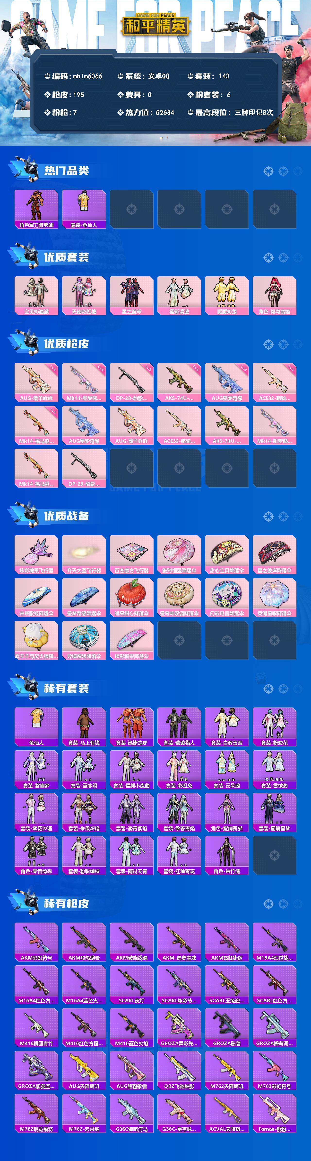 【mhlm6066】安卓 手Q-6粉装-7特效枪-0载具-3粉色飞行器-52634热力值-8王牌印记-143套装-195枪皮